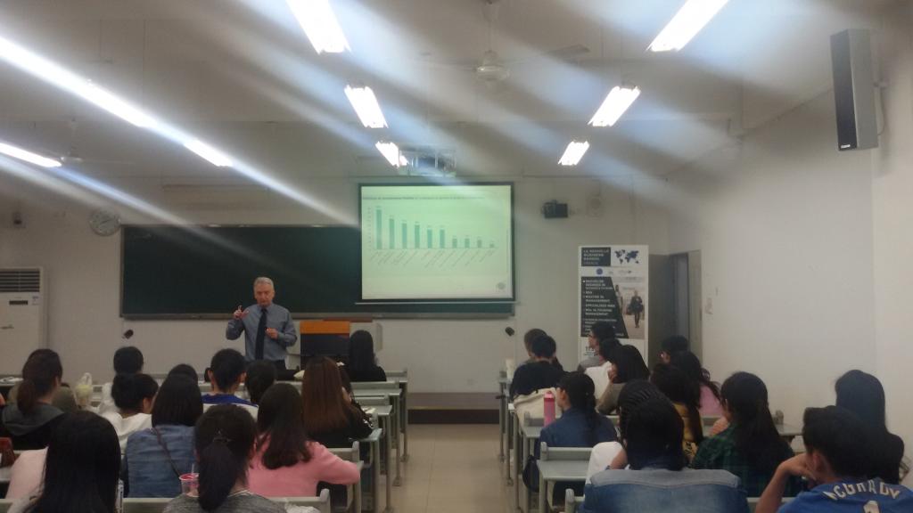 Dominique教授从职业选择、就业途径和方法、实习与国际化视野培养及职业与家庭生活的和谐发展等几个方面作了深入浅出的阐述,他的讲解语言浅显易懂却不失幽默风趣,师生们不时报以会心的笑声和热烈的掌声。Dominique教授还就学生在职业规划中存在的困惑及遇到的问题与他们进行了交流和探讨并给出热心的建议。