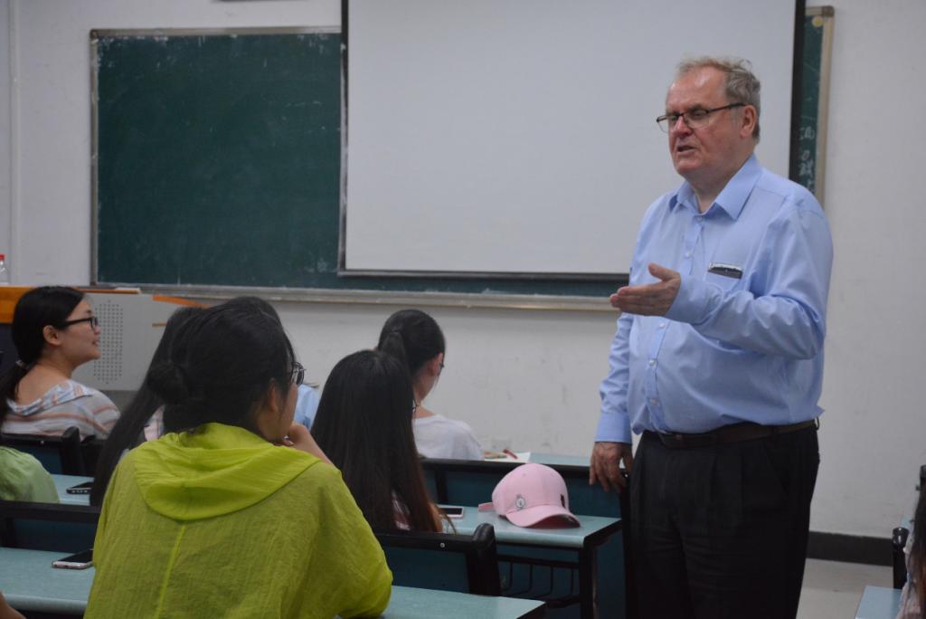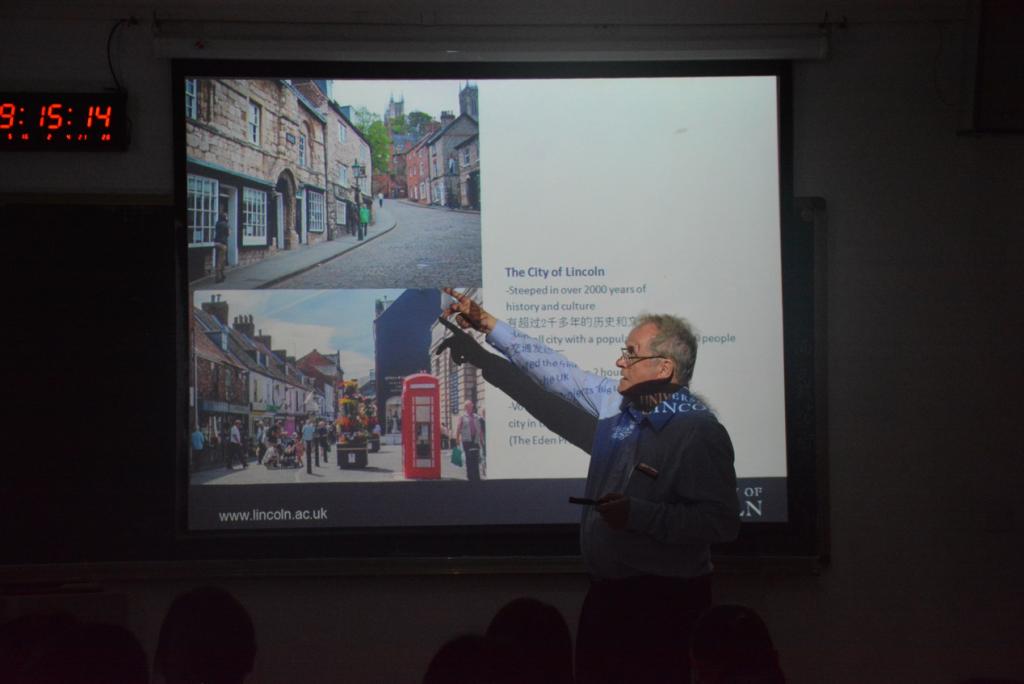Ian Barnes教授作为本次座谈会的主讲人,在开场时表达了对重庆这座魅力火辣之城的由衷的喜爱。他表示,在中国的经济的迅猛发展与国际地位的迅速提高的背景之下,中国城市化的发展速度令人震惊,与他上次到来相比之下,重庆变得越来越有国际都市的模样,重庆人民的生活条件也得到了明显的改善,加上重庆麻辣鲜香的食物与人民似火的热情,他已经完全爱上了这座城市。紧接着,他向我们介绍了英国林肯这座城市,一座位于英国东南部的静谧小城。他说,尽管林肯没有重庆如此源远流长的历史,尽管林肯也没有重庆如此庞大的城市圈与人口,但林肯在历史中沉淀下来的文化底蕴却是挥之不去的。林肯大学就是如此,一所拥有着丰厚文化底蕴的大学,被誉为英国最现代化和最吸引人的校园之一,两次进入英国大学排名前十。林肯大学有来自50多个不同国家的2000多名留学生,是一所国际知名的研究型大学。随后教授向同学们展示了林肯大学的风景照,令人向往。Ian Barnes教授表示,林肯大学与工商大学共同承办合作项目,秉承互利共赢的态度为学生提供一流的教学与丰富的生活体验。座谈会的最后,同学们纷纷发言表达自己的困惑,Ian Barnes教授均耐心地为其解答。随后本次座谈会在副院长周琳的致辞下圆满结束。