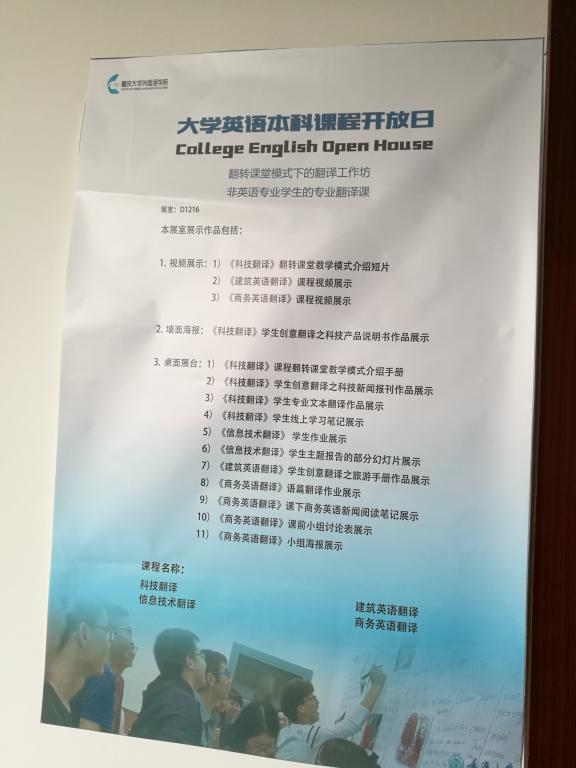此次活动由重庆大学外语学院举办,基于大学外语不同的课程类型分为十五个展览室,对各个课程的教学理念,学习过程,学生成果及师生参与均进行了详尽的展示。其课程种类多样,除了大学英语课程外,还设置了写作,翻译,口语等学业素养英语系列课程;课程形式新颖,作业多采用小组任务形式,注重培养学生的合作能力,协调能力和英语的综合运用能力。通过观摩重庆大学大学英语课程的展示,我们阅读了重庆大学大学英语学生流畅的英文论文、倾听了学生们流利的口语汇演、看到了学生们展示的异彩纷呈的课程海报、感受到了学生们思维能力及自主学习能力的飞跃;从学生们能力的极大提升,我们深深地感受到了重庆大学大学英语教师对教学的热爱,对教学的倾情投入,也深刻地体会到了他们教学中的重重压力。