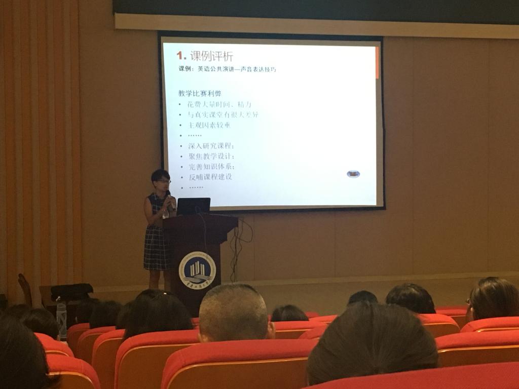 随后,第二师范学院教师发展中心主任及2017年外研社杯“外研之星”教学大赛复赛英语组冠军李佳老师为大家带来了题为“从教学比赛到教师身份构建”的讲座。李佳老师先以本次教学大赛作品为例,阐释了比赛作品在选题,互动和趣味性上都应有所考究。随后,李老师分享了其教授的Public Speaking课程的设计理念,提出好的教学应以文献阅读为支撑,完善教学方法,同时制定明确的目标,了解学生的需求,并进行有效的反馈。通过对以上内容的分享,李佳老师引导老师们思考教师身份构建这一深入话题。她提出教师的身份不仅折射在课堂和教学中,更是其所阅所读所思所想的综合体现。