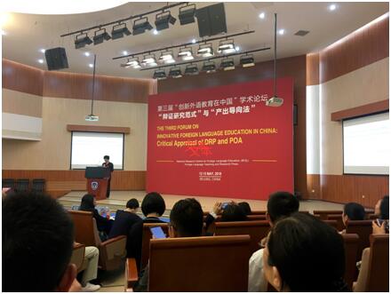 来自北京外国大学的文秋芳教授就DRP在POA发展过程中的运用进行了详细的阐释,同时团队成员就如何利用DRP解决英语教学中的切实问题进行了专题发言;宾夕法尼亚州立大学的James Lantolf教授,伦敦大学贝克学院的Peter Skehan教授等专家参与了讲座与后续讨论,并从各个角度对POA的发展和DRP的运用进行了评析;参加论坛的教师随后也进行了提问,现场氛围热烈。
