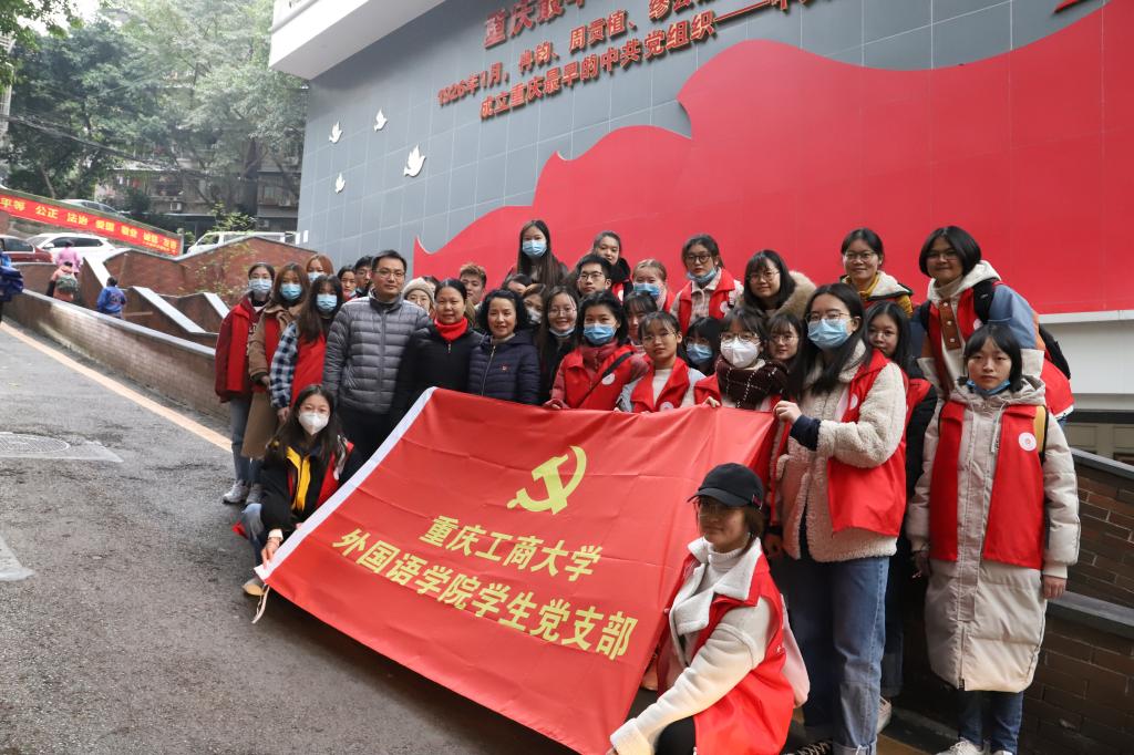 在人和街社区党委书记兼居民委员会主任、2020年“全国劳动模范”陆远秀书记的带领下,同学们走进人和街小区,整洁的街道,葱郁的绿化,同学们参观了重庆最早的党组织诞生地—中法学校旧址,正是在这是,成立了重庆第一个党支部,为中国革命培养了一大批骨干力量。大树掩隐之下,灰瓦黄墙前,面对鲜红的党旗,学生党员们在党旗下重温了入党誓词。