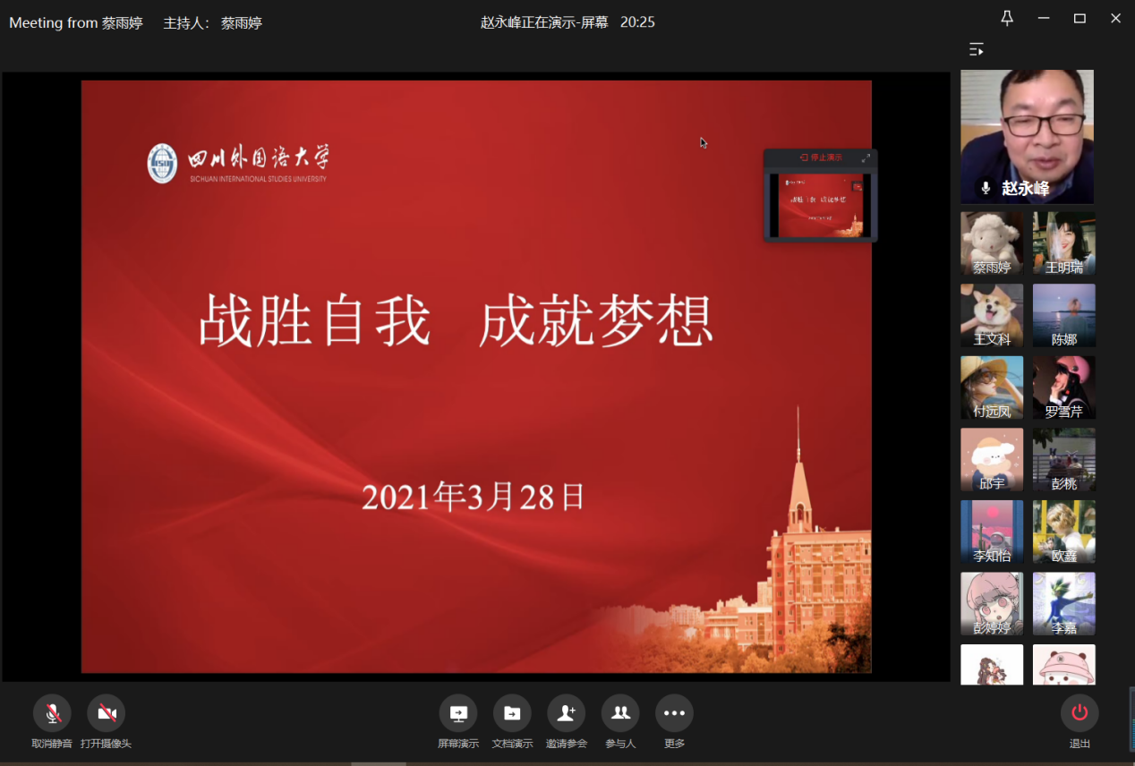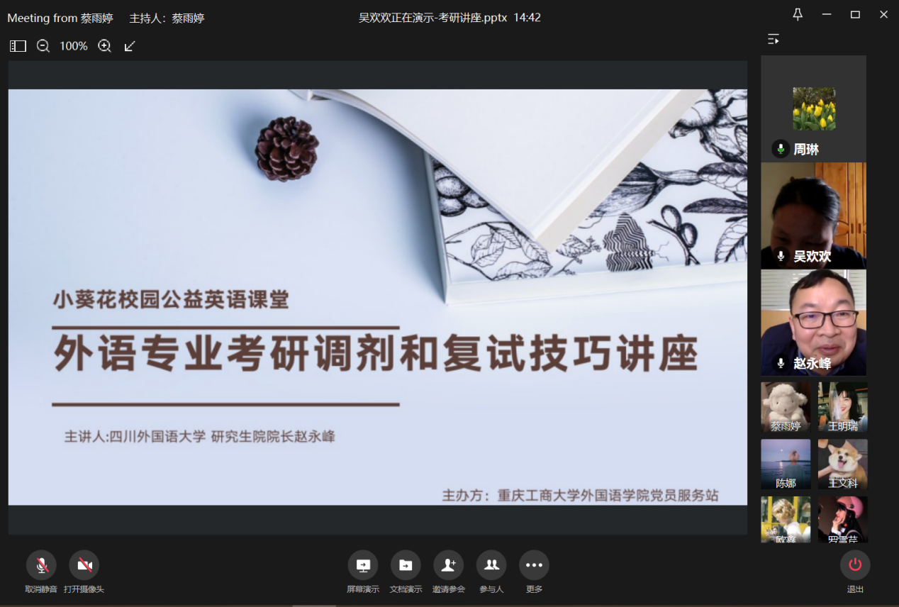 2021年3月28日星期天17:30,由永利集团3044am党员服务站主办,重庆工商大学英语协会协办的“小葵花校园公益英语课堂——外语专业考研备考”线上讲座成功举办。主讲人为四川外国语大学研究生院院长赵永峰,重庆工商大学永利集团3044am院长周琳、永利集团3044am分党委副书记吴欢欢、永利集团3044am大学外语部系主任罗志高及永利集团3044am近200名同学参加本次活动。