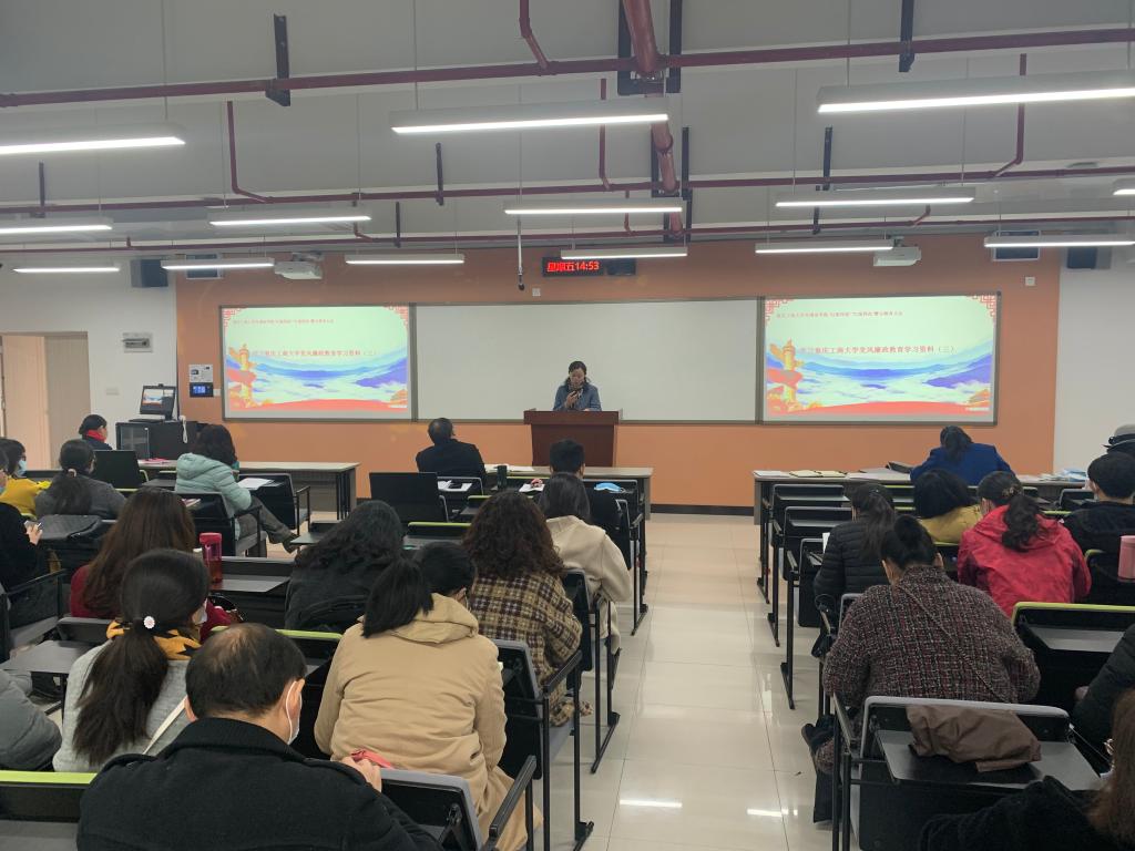 黄志婕老师领学了《重庆工商大学党风廉政教育学习材料》中的部分案例,其中涉及违规公款旅游、违规操办升学宴、违规收受礼品礼金、发表错误言论、学术不端以及招生考试、科研经费管理等领域易出现的违规行为。刘繁副院长针对教师课堂上发表不当言论等方面的违规行为,从自身工作出发强调教师要加强师德师风建设,坚持纪律规范,在招生考试中要提高政治站位,树立规矩意识,她还带着大家一起领学了《新时代高校教师行为十项准则》,提醒老师们要学规则,守规矩。邹莉老师从违规旅游案例出发,为老师们分享了在外出培训开会过程中容易出现的一些违规行为的表现。龙亚老师从科研经费管理角度发表了自己的看法,强调教师要严格按照规章制度报销科研经费,不能为了眼前的利益,造成不可挽回的后果。