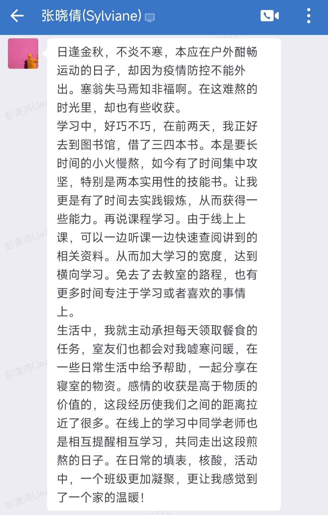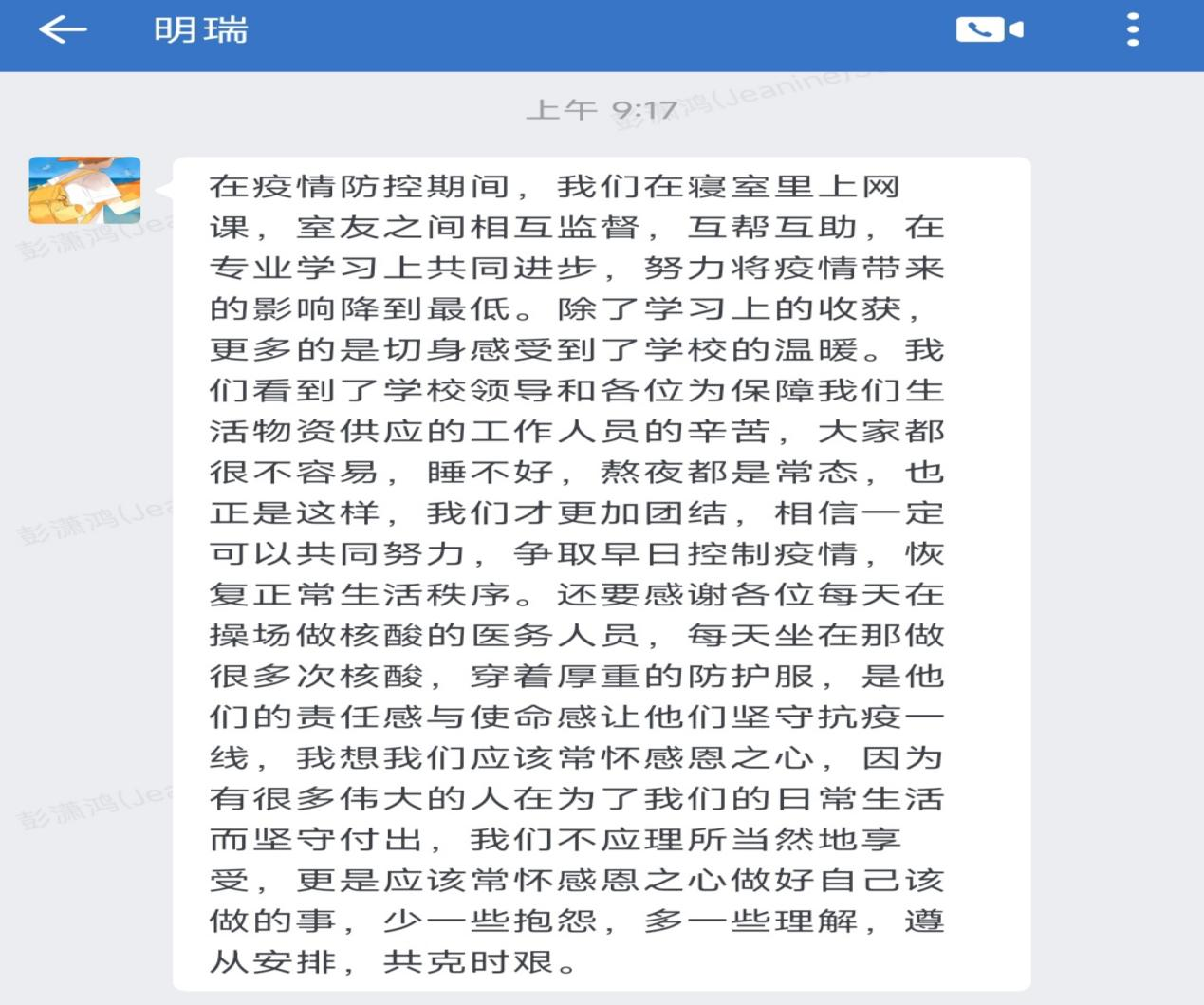 突如其来的疫情打乱了所有人的脚步,但同学们却都以良好的心态面对它,在此期间,有的同学感受到了人间真情,收获到了室友之间的友情;有的同学利用这个机会巩固专业知识学习,提高专业能力;有的同学取餐时与送餐老师相互关心,增进了师生之间的情谊……