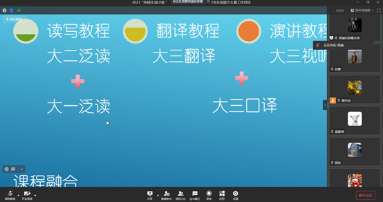 会议的第二个议程为本次比赛组织竞赛和指导竞赛的老师们分享心得。周利民老师首先分享了组织校赛以及准备市赛的过程和具体情况,法语系的周渝老师分享了法语系的竞赛准备情况和经验,主要在于平时教学中“盘活”教材,在课堂教学中有机融入《习近平谈治国理政》多语种版本、党的二十大报告多语种版本、“理解当代中国”多语种系列课程等材料,通过课堂讨论、汇报、主题班会、小项目等方式让同学们多角度深入学习相关时政文献。指导演讲、写作、阅读、笔译、口译的老师们各自分享了指导学生的心得,也为以后可以更好的帮助学生备赛提供了宝贵的经验。