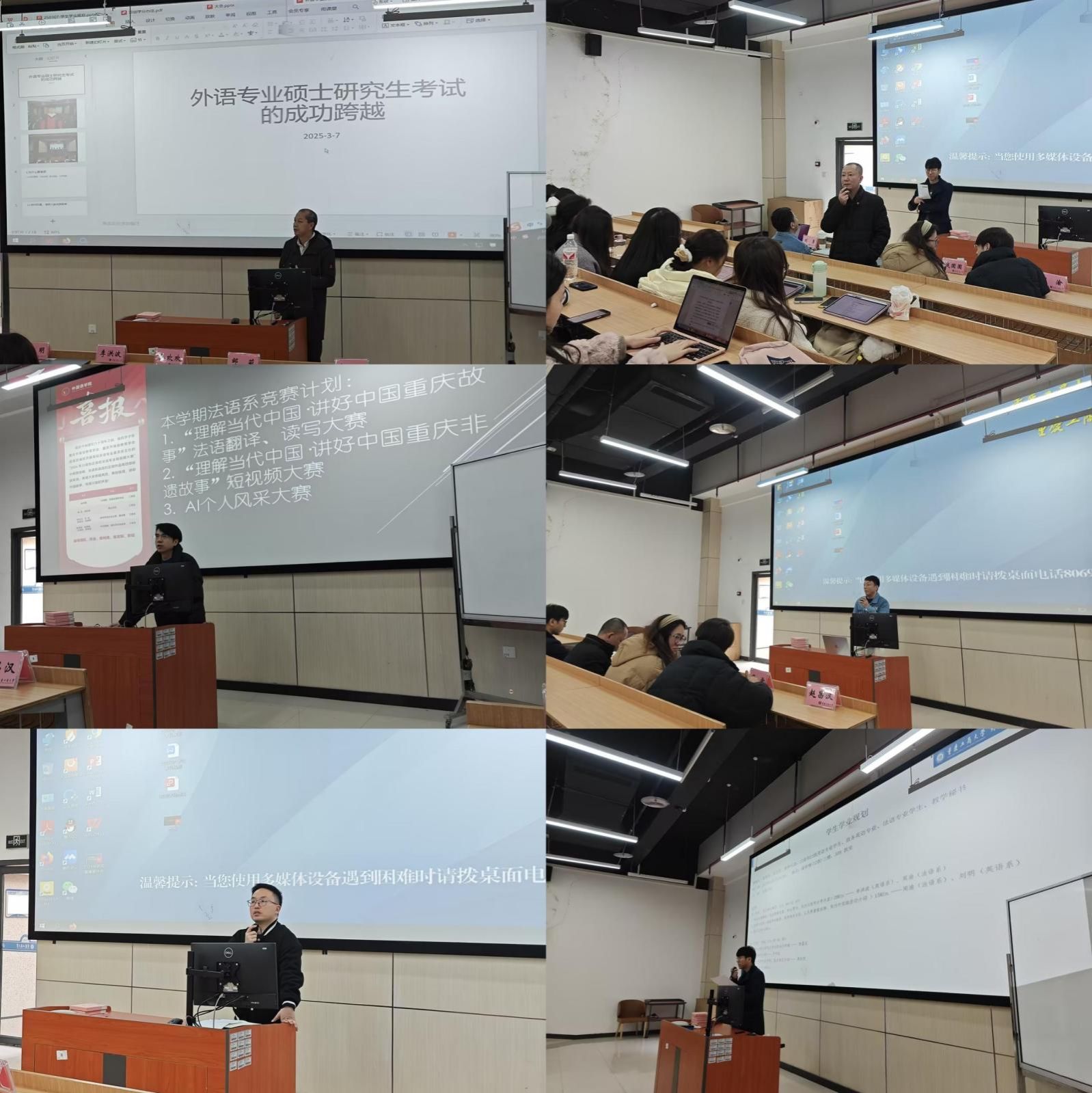 讲座分为两个阶段,内容丰富且极具针对性。在第一阶段,首先由英语系主任李洪波和法语系主任周渝分别对各专业的培养方案进行了深入细致的解读,使同学们对专业课程设置、学分要求、培养目标及发展方向有了更为清晰的认知。随后,法语系主任周渝与英语系副主任刘明就竞赛、实践活动的相关议题进行了详细阐述,并解答了同学们提出的各类问题。在这个过程中,同学们对培养方案及竞赛要求有了深入全面的理解,为后续的学习生涯明确了发展方向。