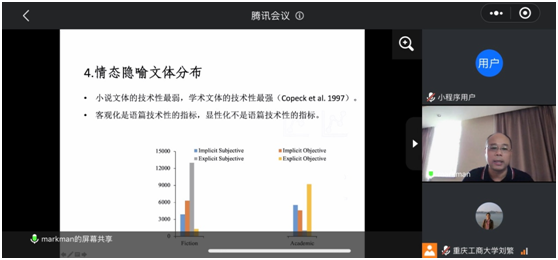 互动交流环节,何教授与线上广大师生围绕Excel表格如何计算R值、人际隐喻与言语行为理论之间的关系、转喻与隐喻关系、语义与语法之间的张力等话题展开讨论。何教授的讲座进一步加深了老师、同学们对英语情态人际隐喻的理解,为学院学科、专业建设提供了新的视角。