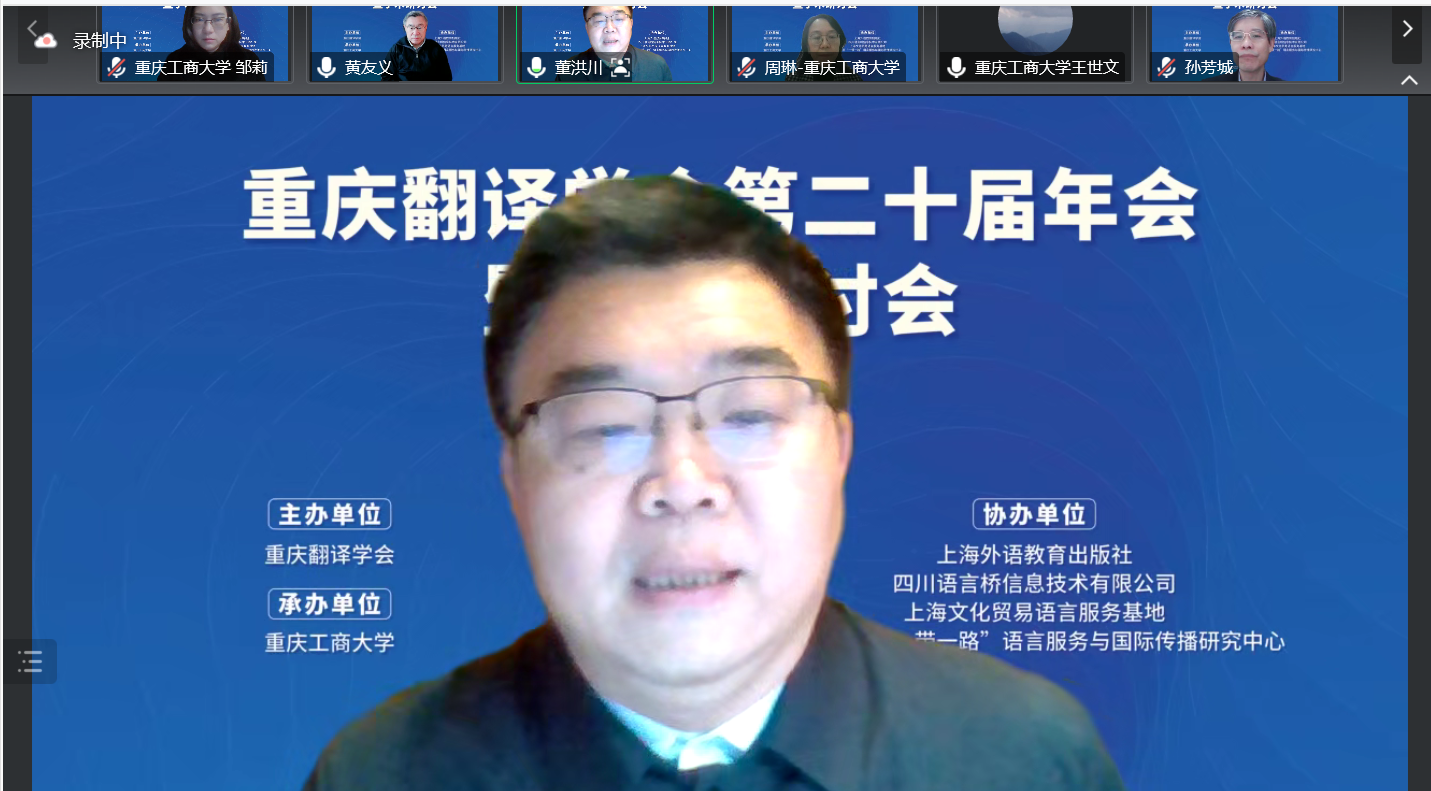 12 月 17 日,由重庆翻译学会主办、重庆工商大学承办的重庆翻译学会第二十届年会暨学术研讨会以线上方式隆重召开。与会专家学者围绕“翻译与中国文化国际传播”这一主题展开了热烈研讨。会议和直播平台上参会者总计近3000人。开幕式由重庆工商大学永利集团3044am院长周琳主持。