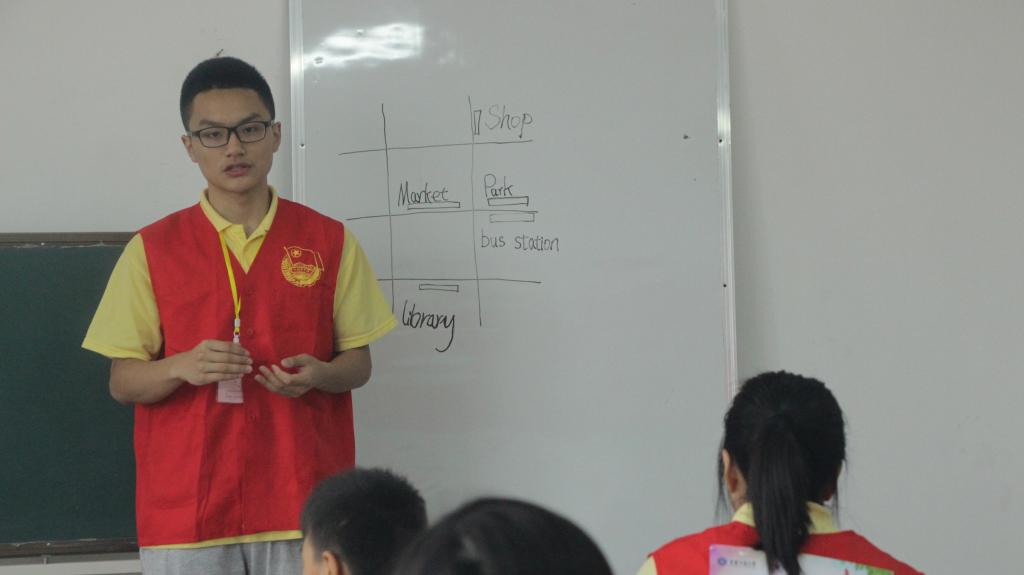 “刚进教室的那一刻我其实被吓到了,”讲授第一堂英语课的刘昊同学这样说道,“后排整整齐齐的坐着高年级的同学,前排一二年级甚至连幼儿园的孩子都有。”看到了这样的情况,他立刻调整了授课内容,将一节课分前后两段进行,课程前半段增授基础英语知识,高年级的同学可以对低年级的孩子们进行帮扶;后半段则讲授一些交际用语,会有其他实践队员进入同学中进行详细辅导。