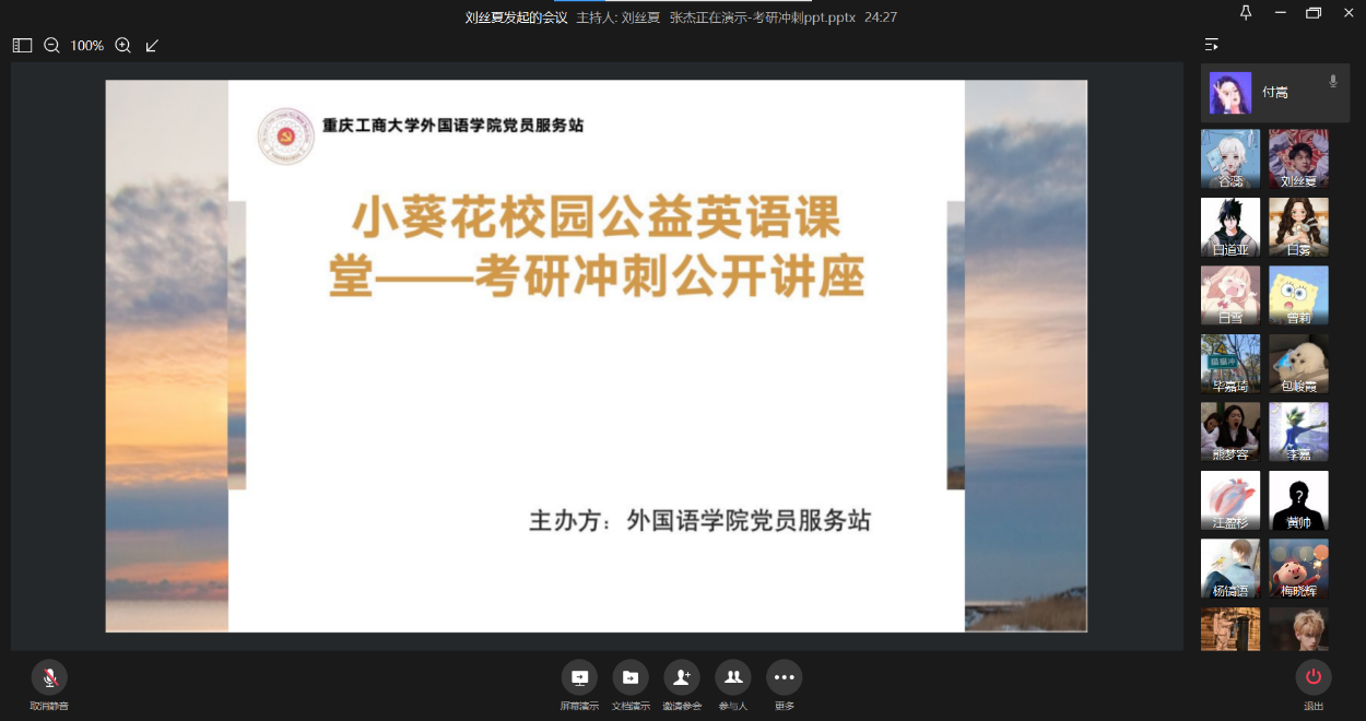 在2022年考研初试即将来临之际,一方面同学们都在紧张备考着,另一方面也面临着不少的压力与烦恼,为了缓解考研同学们的焦虑,让他们更积极地度过最后的考研冲刺阶段,2021年11月12日星期五 19:00-20:30,永利集团3044am党员服务站在企业微信群里以线上的方式成功举办小葵花校园公益英语课堂--考研冲刺公开讲座,本次讲座活动邀请了罗登科老师进行考研冲刺讲解,永利集团3044am2017级毕业生,重庆工商大学会计专业徐蕊,扬州大学学科英语专业付嵩进行考研经验分享。