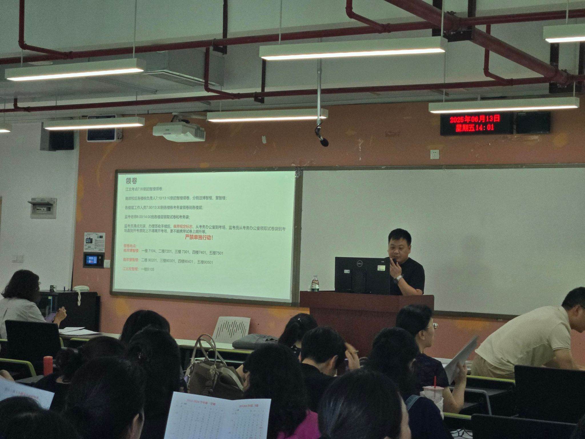 会议伊始,张冰副主任就四六级考试考务工作进行培训,明确了监考的流程、要求和纪律。刘繁副院长着重强调期末考试监考及阅卷纪律,明确规范监考流程与阅卷标准,确保考试的公平公正。张冰副主任介绍期末无纸化阅卷及成绩录入工作,以保障成绩管理的高效与准确。
