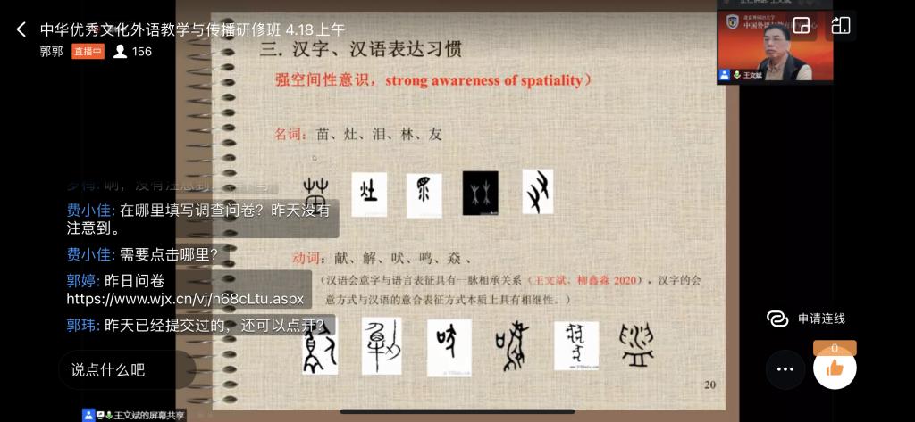 该培训由七场专家讲座组成,复旦大学马克思学院唐明燕副教授从 “中华传统文化的总体格局与精神内涵”和“儒家文化的核心要义与现代传承”两方面深入浅出地呈现出了中华传统文化的精髓,并对中国文化同英语教学的融合提出了可行性的建议; 华中农业大学谢定源副教授介绍了“中国传统饮食文化” 并引导大家探索如何将其导入大学英语教学之中;在 “中华文化英语课程建设、教学与资源建设”的讲座中,东华理工大学廖华英教授分享了她及其团队二十年打造中国文化双金课程的心路历程和宝贵经验;北京外国语大学王文斌教授主讲的“文化自信与新时期高校外语教育”中,王教授高屋建瓴地比较了中英文字语言,展示了中文的深厚底蕴和语言智慧,切实助力文化自信的打造;山东大学万玮敏副教授和暨南大学冷璐博士分别呈现了中国优秀文化融入读写和视听说课程的教学设计,回答了中国优秀传统文化融入大学英语课程的原因和意义,并在教学目标、模式、内容和方法的选择上提供了许多有价值的具体案例。