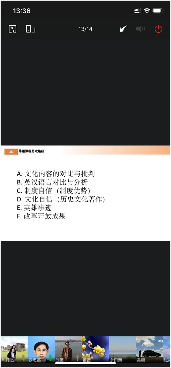 教研活动的主要内容为:1)交流和探讨如何更好地在大外教学实践中体现育人目标;2)推进AB班课件修改工作,优化思政内容。在教研活动中,张颖老师分享了自己的优秀教学案例,讲解其设计思路和实现路径,强调课程思政应基于单元主题挖掘要点,避免内容脱节和空洞,同时教师要注重平时积累,结合时事热点融入思政目标。廖文玉老师结合自己的教学实践讲解如何“润物细无声”地进行课程思政,积极倡导传播正能量。陈丹杰老师引用文秋芳教授的“四条思政链”作为大外课程思政实施的指引框架,并建议加强课程思政团队的各层级建设。罗主任从教学研究角度出发,鼓励大家将理论和实践结合,申报课程思政课题,并部署了教学内容建设工作。