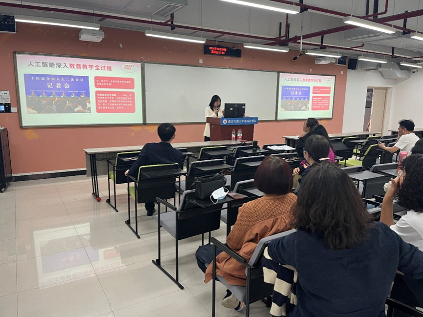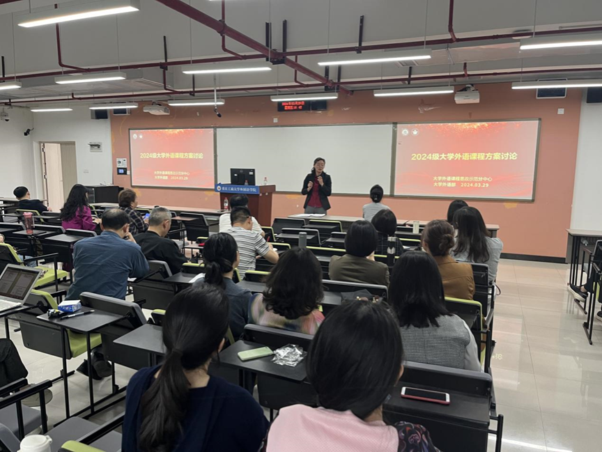 王文丹女士讲座结束后,大学外语部教师继续进行了新文科背景下2024级大学外语课程方案专题研讨。刘繁副院长还针对2024年本科教育教学审核评估工作,梳理了从开学初到三月底组织教师进行教学三大件的整改和完善的情况,通报了督导对2023-2024(1)试卷的审核反馈,并布置了下一步本科教育教学审核评估工作。