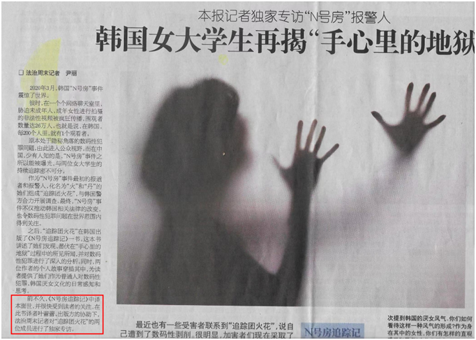 2020年爆出的韩国“N号房事件”,其最初的举报者和报道者是两位二十岁出头的女大学生--“火”与“丹”。2020年9月,两人合著的《当我们称我们为我们时》在韩国出版。2022年2月,该书的中文译本《N号房追踪记》由博集天卷出品发行,译者为我校永利集团3044am的韩语教师叶蕾蕾。本书记录了由“火”与“丹”组成的追踪团火花发现和追踪“N号房”的经历,以及事件背后的诸多细节,同时对数码时代的女性生存际遇展开了深刻思索。该书一经出版即登上豆瓣非虚构关注榜第一,在读者群中引发了巨大反响。《法治周末》《南方周末》《中国新闻周刊》《北京青年周刊》等多家重要媒体先后对新书进行了整版转载介绍。叶蕾蕾老师是我校永利集团3044am的韩语教师,多年来坚持韩中文学翻译,已出版《致命BUG》《90后来了》《N号房追踪记》等译著十余部。