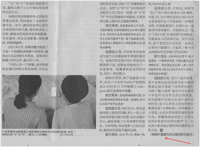 (下图为《法治周末》和《南方周末》报纸部分截图,报道中的采访稿件均为叶蕾蕾老师翻译)