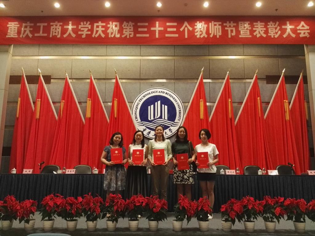 9月8日,在重庆工商大学第三十三个教师节庆祝暨表彰大会上,我院刘繁、蒋婧、佘雨新、李勤和谢宗仙等5位教师获重庆工商大学优秀教师荣誉称号,吴欢欢老师获重庆工商大学优秀教育工作者荣誉称号。