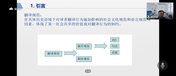 1月14日上午,应永利集团3044am邀请,上海外国语大学语料库研究院院长、博士生导师胡开宝教授通过腾讯会议作了题为“基于语料库的记者招待会汉英口译句法操作规范研究”的讲座。讲座由副院长邹莉主持,学院师生370余人参加了此次讲座。
