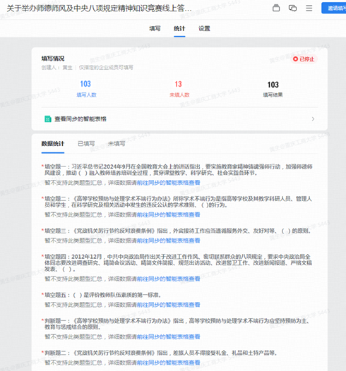 为进一步巩固拓展学习教育成果、锲而不舍落实中央八项规定精神、推进作风建设常态化长效化,同时,为进一步加强师德师风教育,引导学院广大教师坚定理想信念、厚植爱国情怀、涵养高尚师德,为推进强国建设积极贡献力量,永利集团3044am工会于2025年10月21日—24日举办了师德师风及中央八项规定精神知识竞赛线上答题活动。学院103名工会会员参加了活动。
