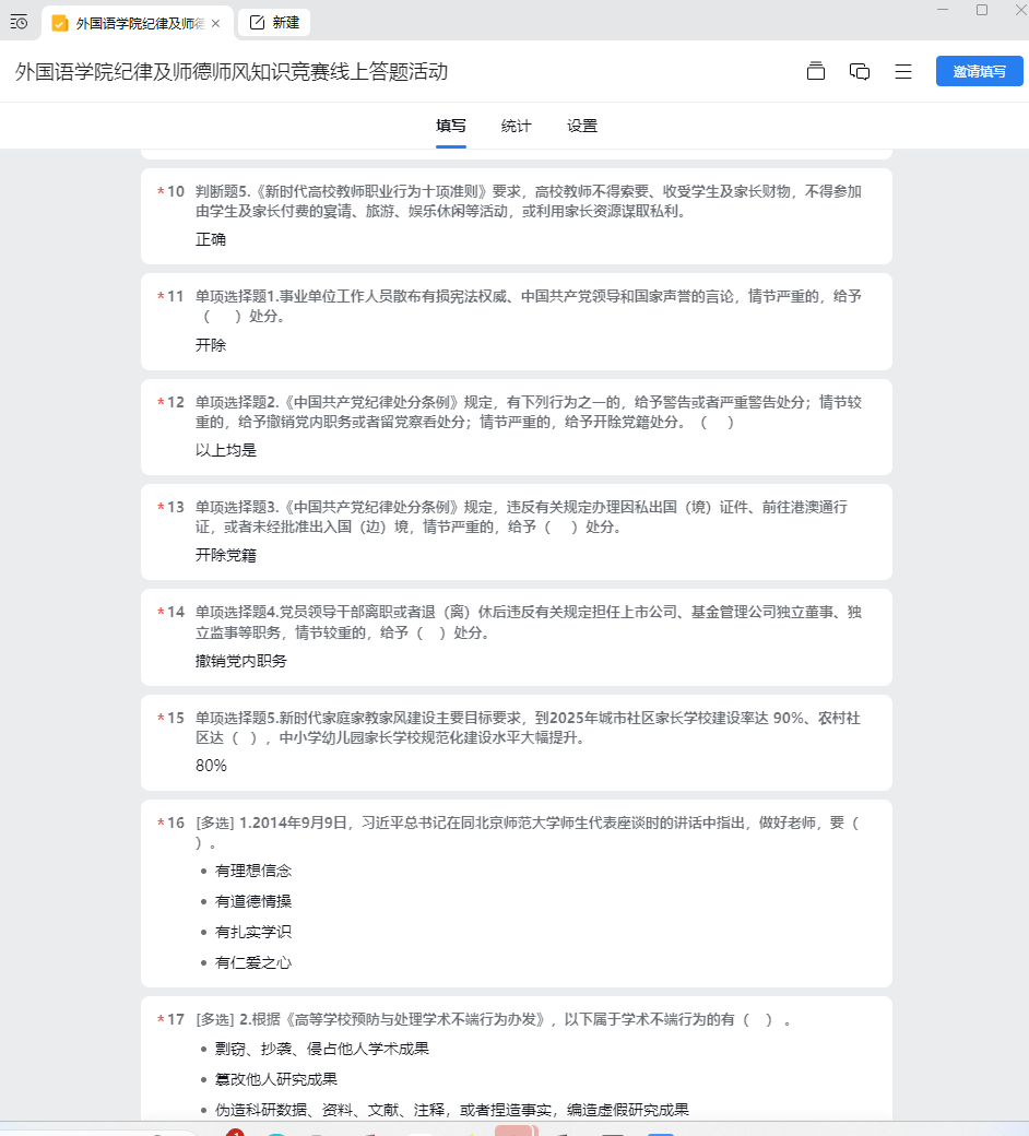 本次竞赛采取企业微信线上答题的形式。竞赛试题覆盖《中国共产党纪律处分条例》《事业单位工作人员处分规定》《关于进一步加强家庭家教家风建设的实施意见》《新时代高校教师职业行为十项准则》《高等学校预防与处理学术不端行为办法》以及习近平总书记关于教育的重要论述等内容,分填空题、判断题、单项选择题和多项选择题四种题型,共20道题目。
