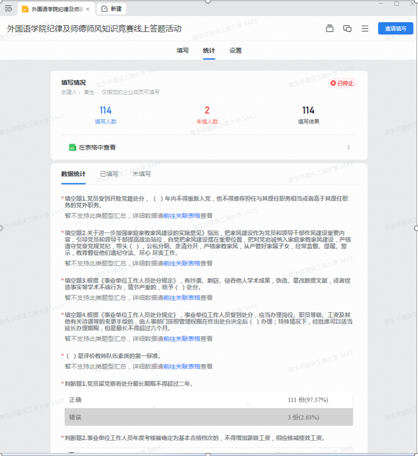 活动中,共114名会员在规定时间内完成了答题。从答题情况看,老师们对纪律规定及师德师风知识掌握得比较好,每道题目答题正确率均较高。