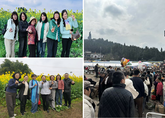 下午,老师们乘车前往享有“中国最美油菜花海”“重庆十大春季旅游目的地”等荣誉称号的崇龛镇陈抟故里。这里不仅有万亩规模宏大的花海景观,还有直径达236米的世界最大油菜花太极图。由于今年免门票,前来赏花的游客人山人海、络绎不绝,才出高速路口,就已经堵得水泄不通了,沿途车上的乘客都只好纷纷下车,穿梭在车流间隙里,还没有到达赏花的中心地段,老师们就已经走散了,我们只好在群里叮嘱大家自行赏玩。大家三三两两、穿梭于田间地理,赏花、嬉戏、拍照留念,呼吸着乡村清新的空气,尽情地感受着春天之美。