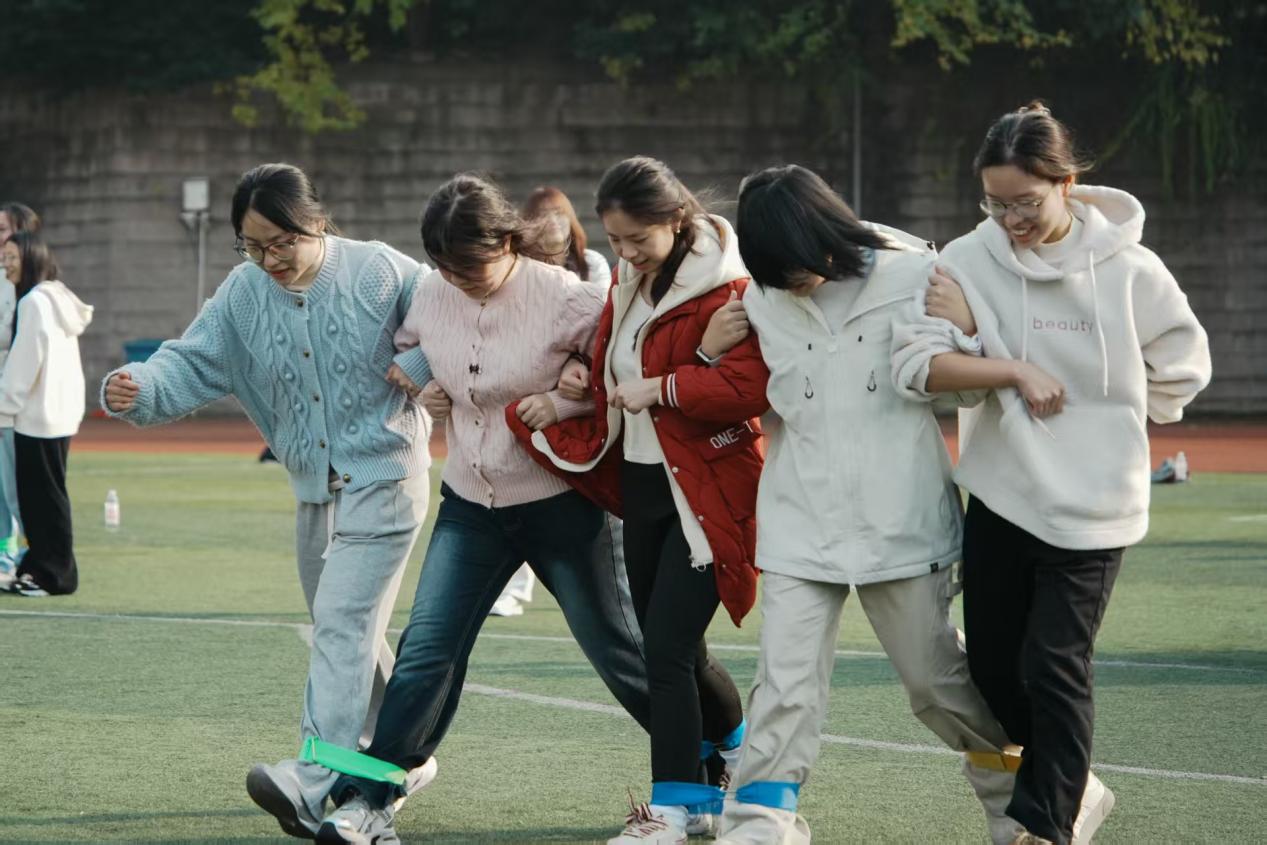 “五人六足”比赛将整场活动推向高潮。每队十名同学分为两组接力,五人一组将相邻的腿两两绑紧,以“五人六足”的特殊形态协同前行。比赛要求队员在快速行进中精准把控步频与步幅的统一,极大考验着团队的默契度与协作力。开赛之后,各队并肩奋进、配合无间,响亮的口号与整齐的步伐彰显着强烈的团队精神,队员们团结奋进的身姿,成为绿茵场上最耀眼的光芒。
