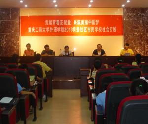 6月27日上午,重庆工商大学外语学院2013同景社区市民学校启动暨社会实践基地签约挂牌仪式在同景社区会议室成功举行。出席启动仪式的嘉宾有同景社区居委会主任李小渝、同景社区市民学院负责人周欣、外语学院党总支书记申卫东、分团委书记冉永琴。外语学院10名暑期社会实践志愿者和社区近70名小朋友和家长参加了启动仪式。