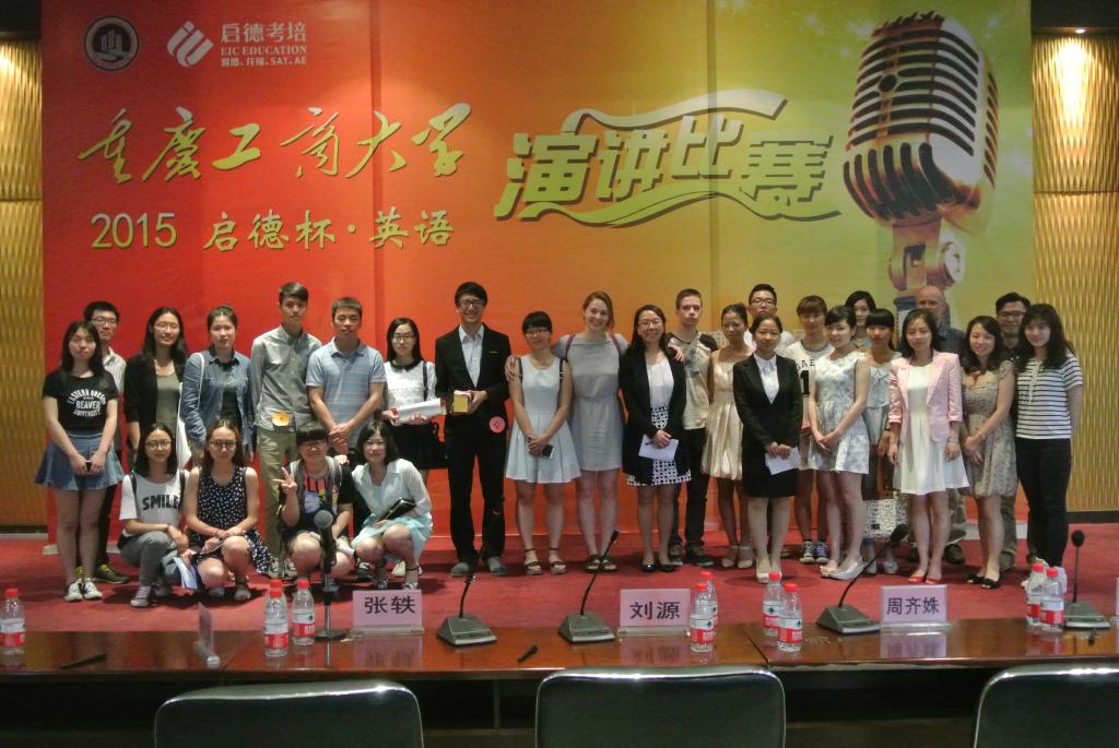 2015年5月29日13点30分,由重庆工商大学校团委主办、外语学院分团委学生会承办、启德教育独家赞助的重庆工商大学2015“启德杯”英语演讲比赛在田家炳书院408报告厅正式拉开帷幕。出席本次大赛的嘉宾有外语学院党总支申卫东书记、外语学院副院长周琳教授。担任本次比赛的评委分别是:Aubrey、David、周齐姝、龙亚、刘源、张轶、启德教育培训学校校长瞿世源老师。