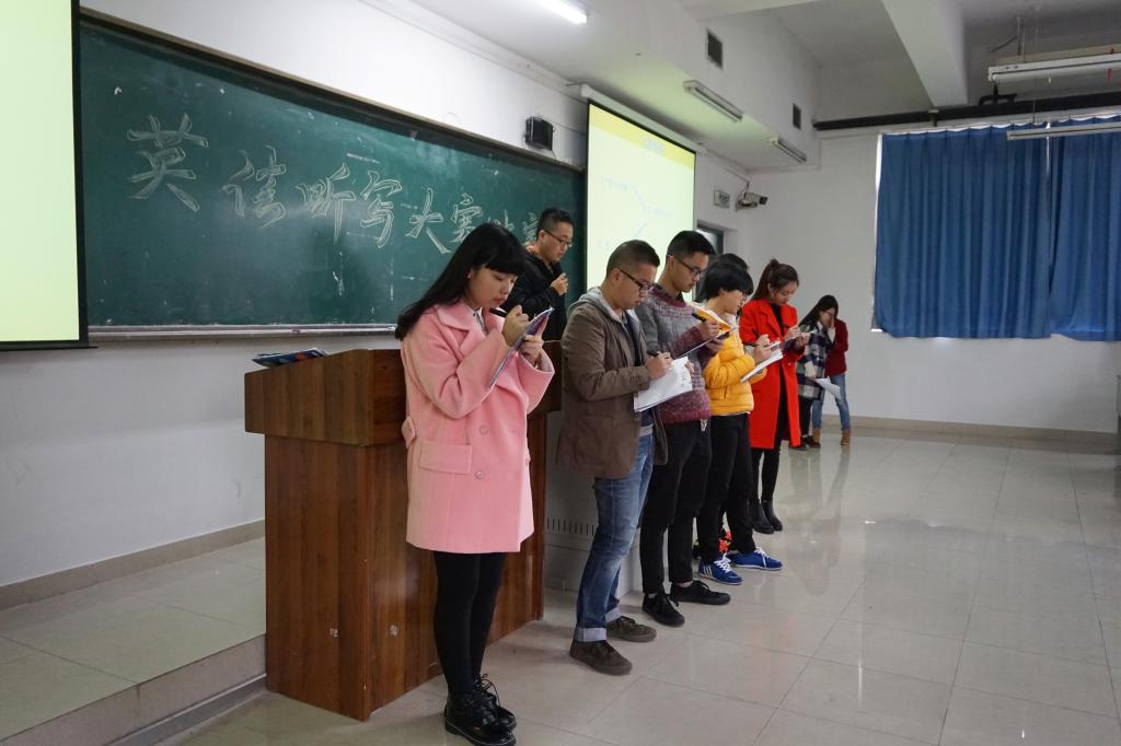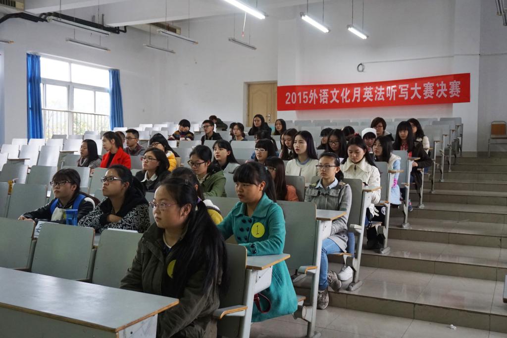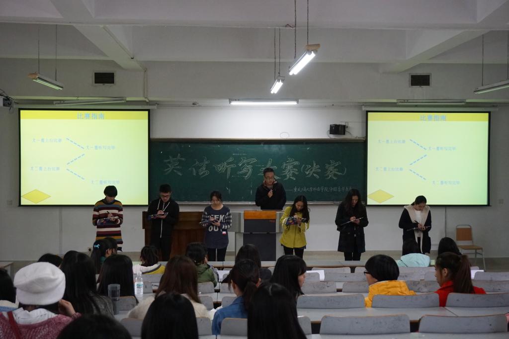 2015年11月27日14点,由共青团重庆工商大学委员会主办,外语学院分团委学生会承办的2015外语文化月之英法听写大赛在博智楼07321成功举办。13级法语班樊兴同学、14级英语班韩蕴蔚同学担任本次大赛听写官。比赛由15级英语班鲍雁宏、唐璐同学主持。