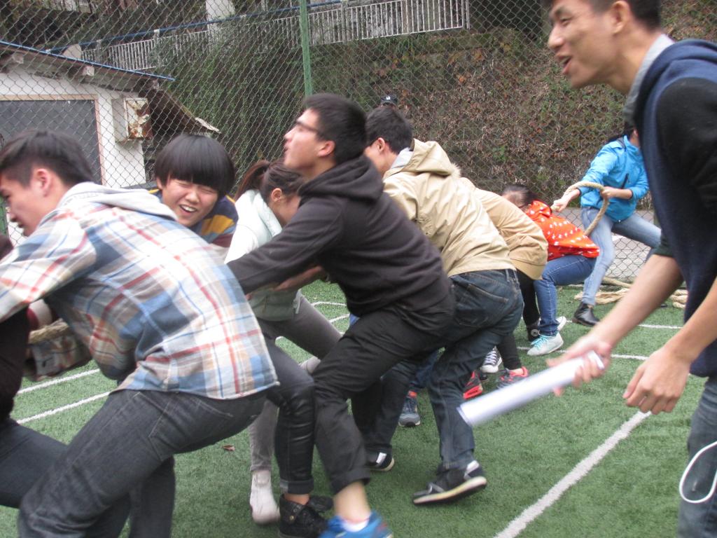 本次运动会共分为集体和个人两个大类,集体项目分别是:大力水手、扔沙包、这就是命、乒乓球接力,个人项目是平板支撑。14时整,活动在各班喊出气势磅礴的口号后拉开帷幕。第一个竞争项目是大力水手,各班各派出4男8女参加。赛前五个班的文体委员抽签,抽中红色的一队直接进入下一轮,另外四队两两PK。第二轮比赛由胜利的两队和落单的一队抽签,抽中红色的一队直接进入下一轮,其他两队PK,输方获三等奖。第三轮由第二轮赢方与抽中红色的队伍PK,评出一、二等奖。法语二班因两次抽签都抽中红色被冠以“运气王”的称号,与第二轮获胜的商英二班进行了激烈的角逐,虽然法语二班在前两轮中养精蓄锐,在决赛时蓄势待发,但还是输给了在前两轮中累积了大量经验的商英二班。最终,商英二班斩获了大力水手一等奖的桂冠。