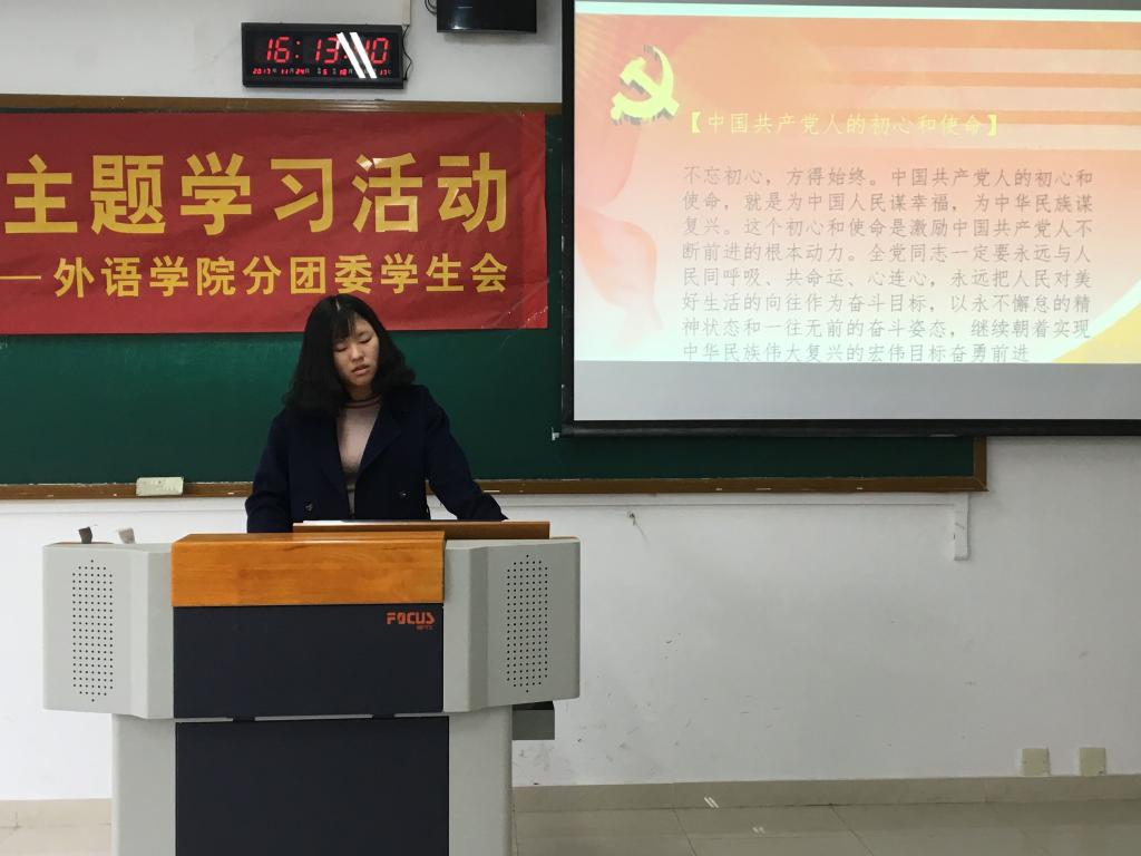 2017年11月24日下午4点,外语学院分团委学生会“学习十九大,携手青春行”主题学习活动在南岸校区07410圆满举行。本次会议由外语学院分团委副书记雷雨佳主持,学生会主席唐丽、副主席唐垒以及分团委学生会的全体干部干事们共同参与。