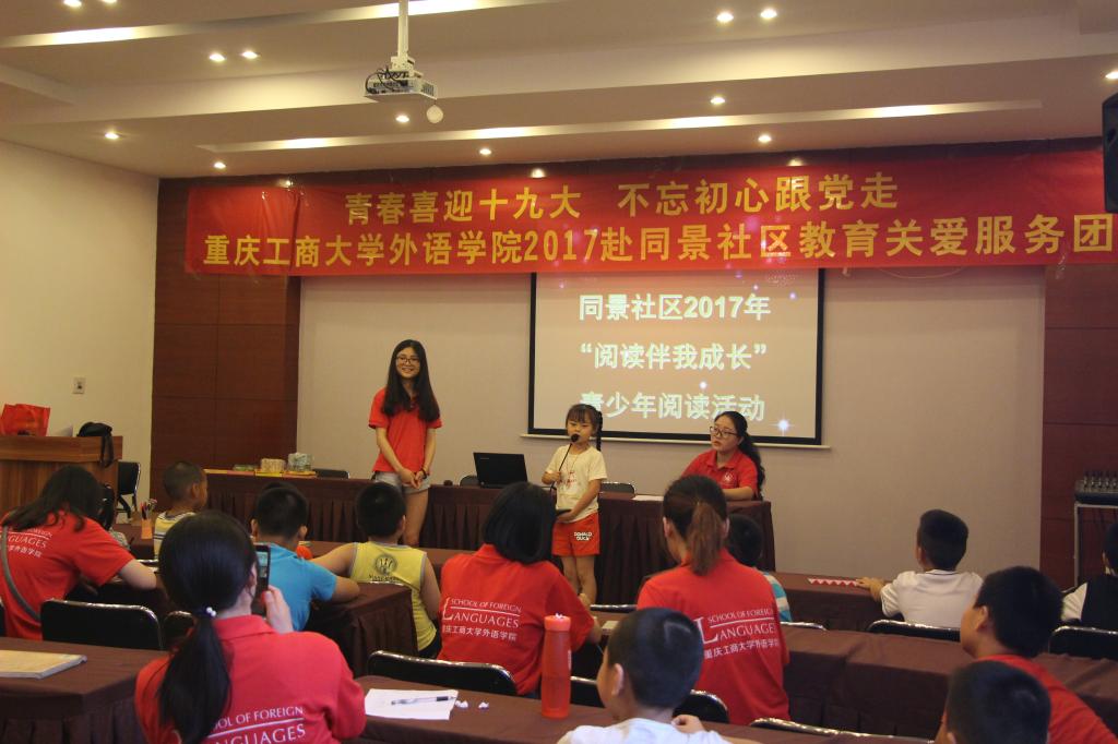 为了响应党的号召,推动社会的不断发展,关注少年儿童的全面成长,2017年7月18日,重庆工商大学外语学院2017暑期社会实践团队志愿者与同景社区的工作人员开展了“阅读伴我成长”青少年阅读活动、“马路小天使”及“环保小卫士”的活动。
