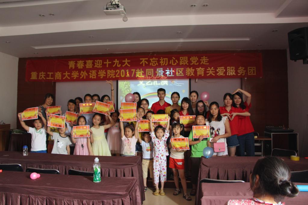 7月21日上午,重庆工商大学外语学院2017赴大堰社区、同景社区教育关爱服务团队的暑期社会实践活动在文艺汇报表演中结束。