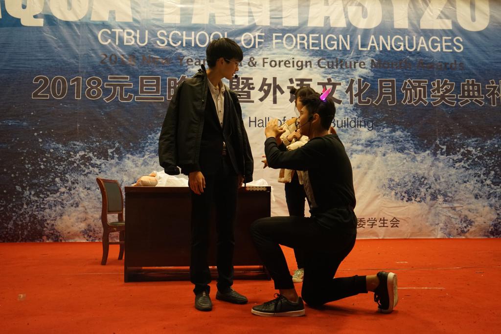2017年12月30日晚18点30分,由重庆工商大学外语学院主办、外语学院分团委学生会承办的2018年元旦晚会暨外语文化月颁奖典礼在南岸主校区7100报告厅成功举办。重庆工商大学外语学院副院长周琳教授、外语学院党总支陆嘉书记、外语学院英语系主任邹莉老师、外教Jonathan受邀出席晚会,全校各兄弟组织主席团也受邀参与了此次活动。