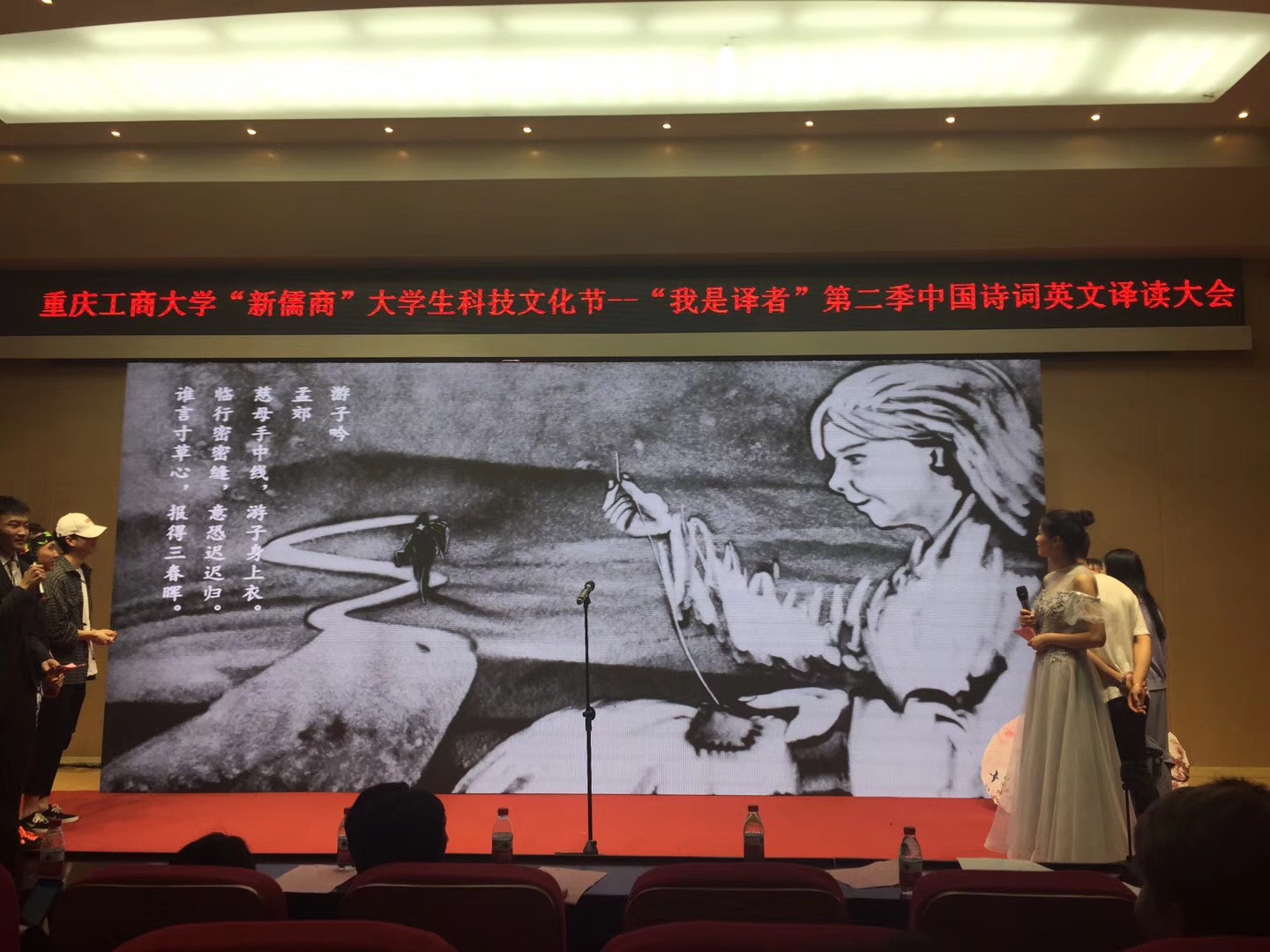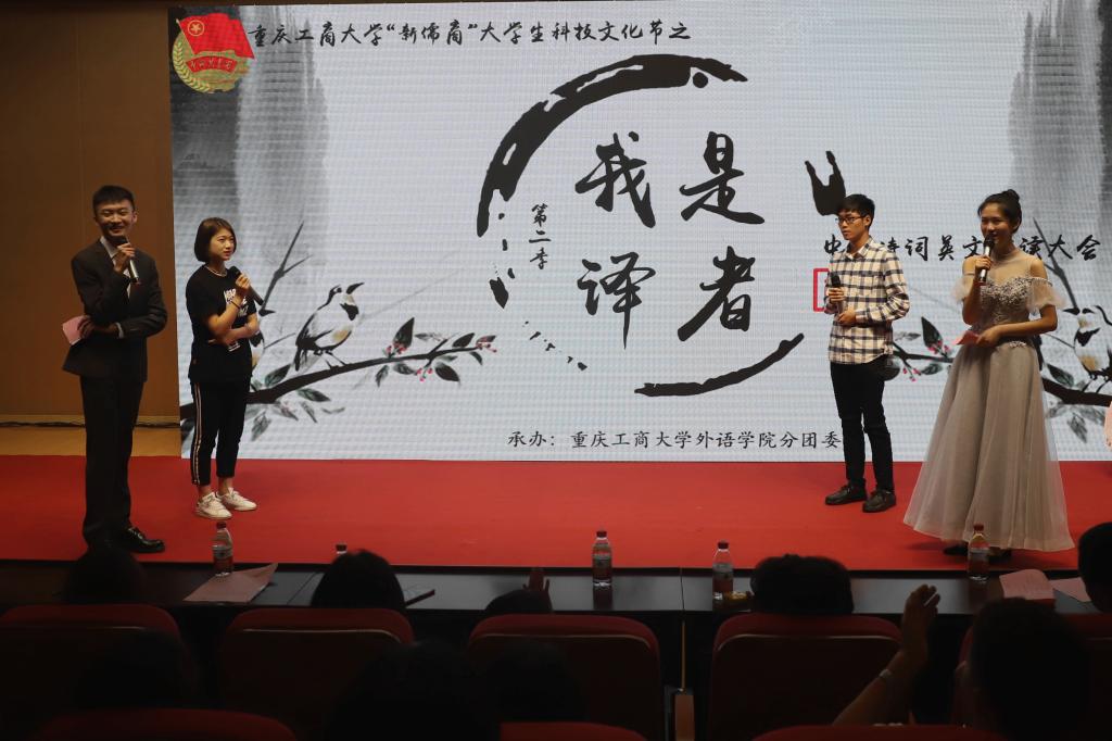 2018年4月20日,由共青团重庆工商大学委员会主办、外语学院分团委承办的重庆工商大学“新儒商"大学生科技文化节之“我是译者”第二季中国诗词英文译读大会在田家炳209报告厅成功举办。重庆工商大学学工部部长、学生处石世明处长、外语学院党总支陈晓东书记、外语学院副院长周琳、外语学院党总支副书记陆嘉出席了本次活动,外语学院刘勇老师也作为点评嘉宾参加了活动。