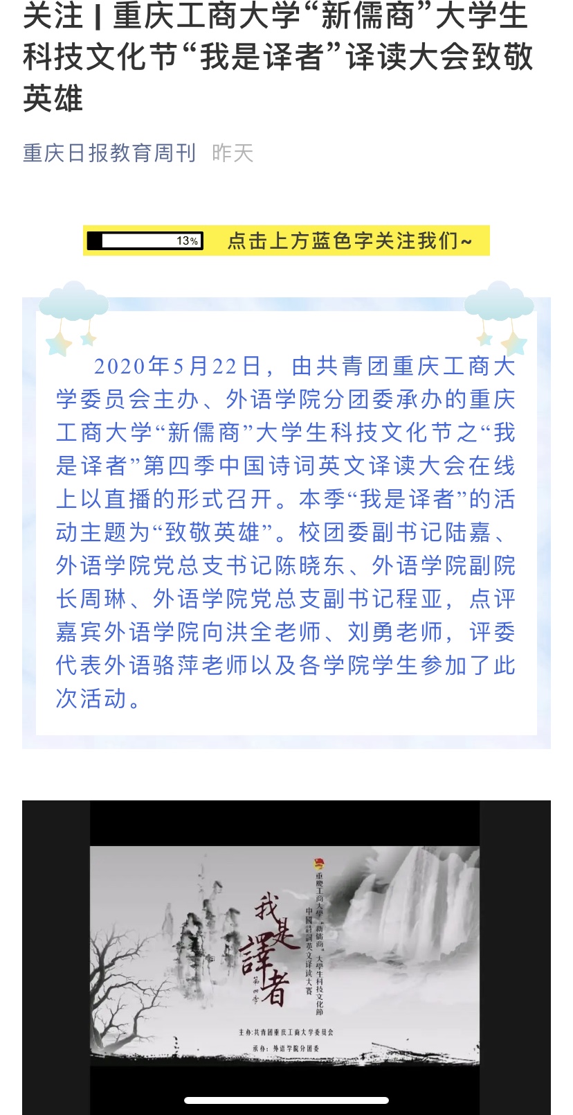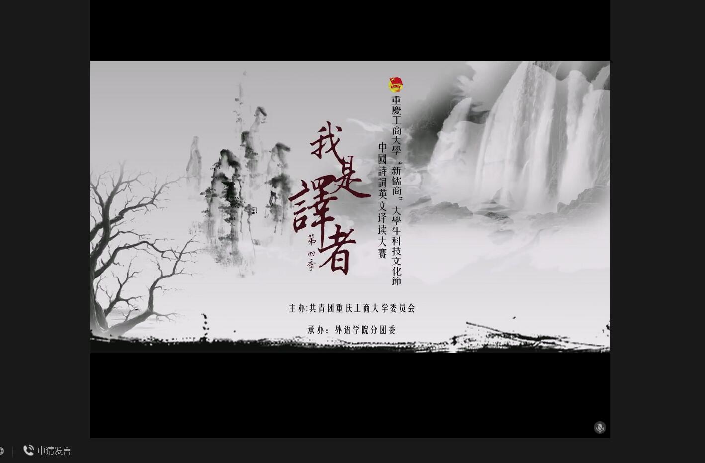 2020年5月22日,由共青团重庆工商大学委员会主办、外语学院分团委承办的重庆工商大学“新儒商”大学生科技文化节--“我是译者”第四季中国诗词英文译读大会以线上直播的形式成功举办。本季“我是译者”的活动主题为“致敬英雄”。