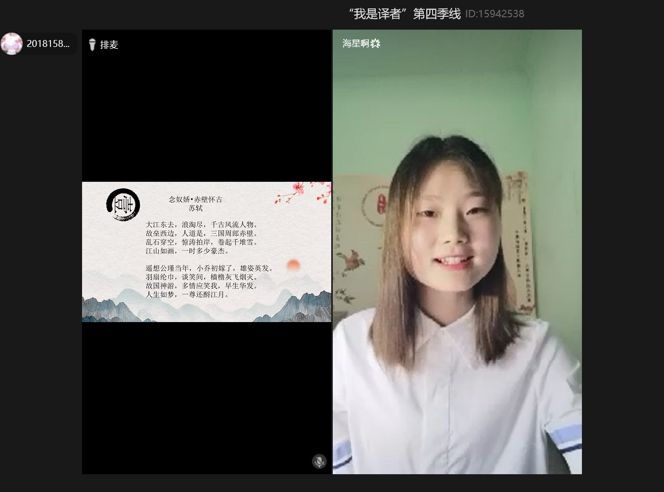 “我是译者”活动自2017年至今已连续开展四季,本次活动共收到全校各专业同学的作品三百余份,最终评选出获奖作品24份。活动伊始,开场视频向观众们呈现了数百年来为中华民族独立、为新中国建设而做出贡献的英雄们,有“砍头不要紧,只要主义真”的夏明翰;有四川木里火灾救援牺牲的消防战士;有抗击新冠肺炎疫情的医护人员……本次活动意通过诗词表达对英雄的歌颂和赞美。