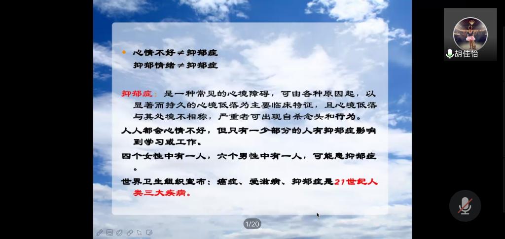 本次活动采取线上直播方式进行。首先,胡佳怡老师根据多年工作经验,指出了大学生常见的七种心理问题:强迫症、广场恐惧症、厌食症、性别认同障碍、多重人格障碍、嗜睡症、抑郁症,特别对抑郁症进行了详细的讲解,教会家长如何识别抑郁症,如何科学认识和处理孩子的抑郁症。之后,家长们积极参与交流,胡老师也对学生家长提出的问题进行了一一解答。