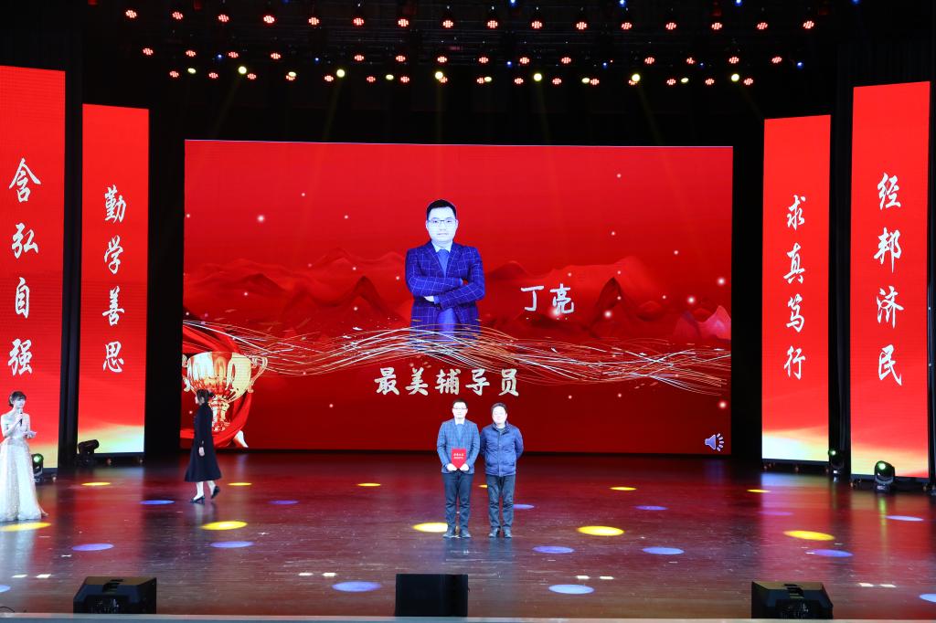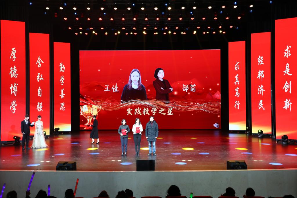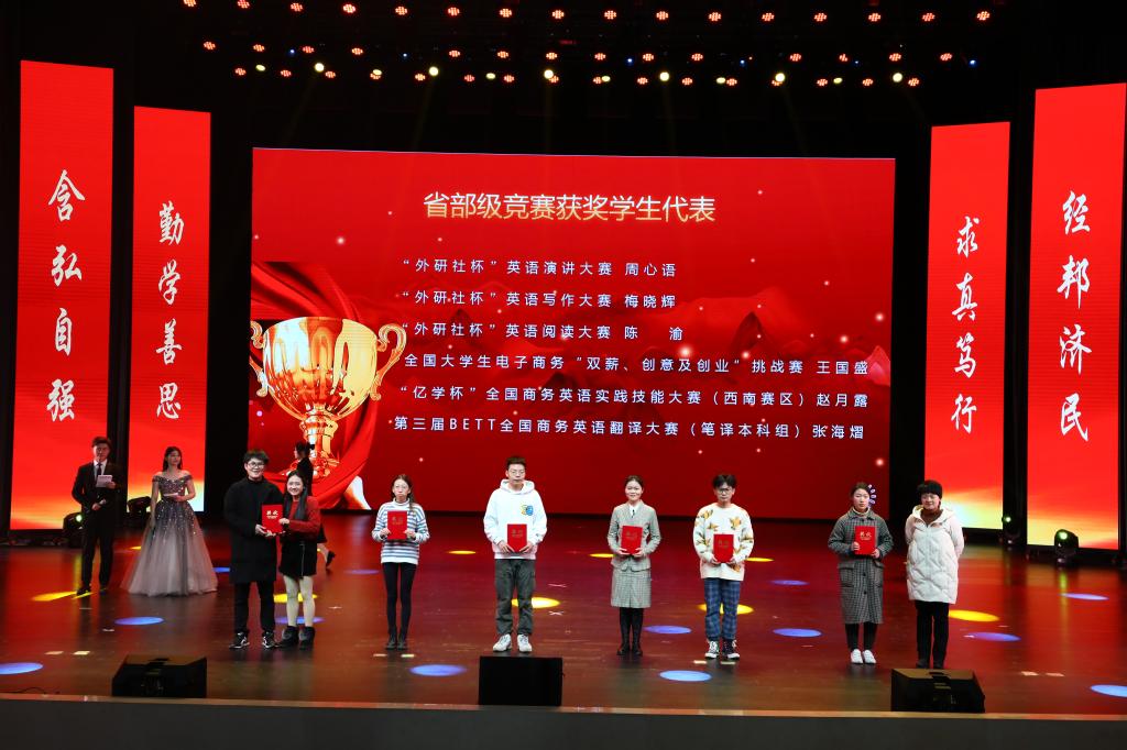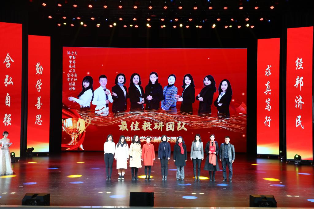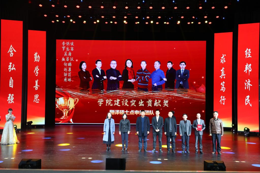 在教师颁奖环节中,李志雄为学院建设突出贡献奖“翻译硕士点申报团队”颁奖,李国军为学院最佳教研团队“综合商务英语教学团队”颁奖,李敬为最佳教研团队“PBL大学英语教学团队”颁奖,申卫东为学院“最美辅导员”丁亮老师颁奖,骆东奇为学院“教学之星”史凤晓、钱圆圆、蒋婧老师颁奖,钟增胜为学院“实践教学之星”王佳、邹莉老师颁奖,杨娟为学院“科研之星”向鹏、罗志高、朱红梅老师颁奖,于频为学院“综合管理之星”杨燕老师颁奖,张轶为学院工会活动之星“啦啦操团队”颁奖。