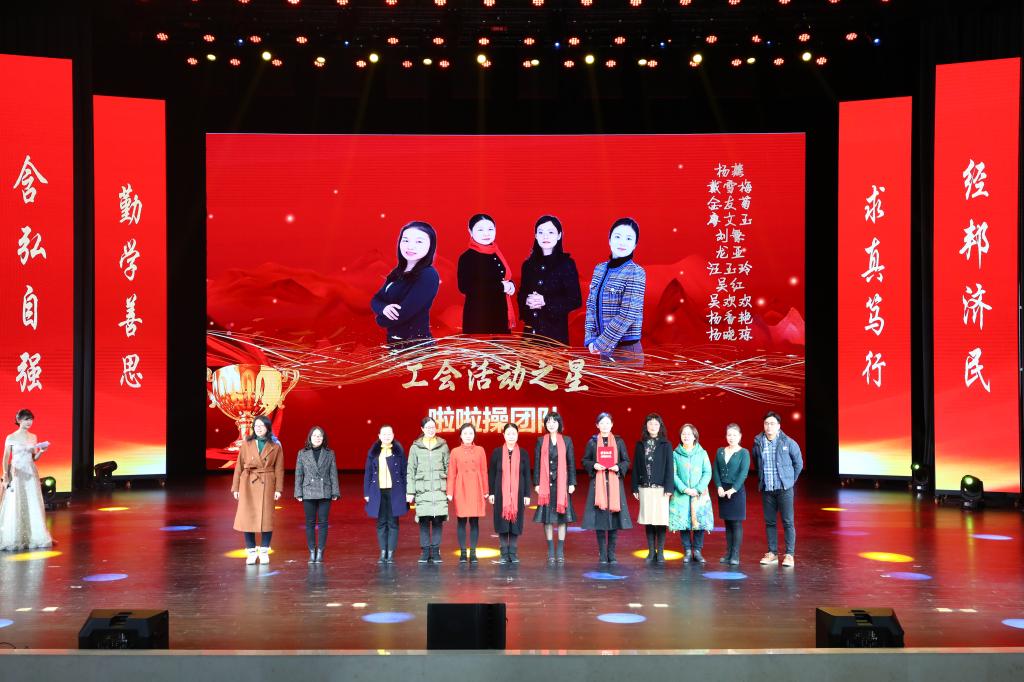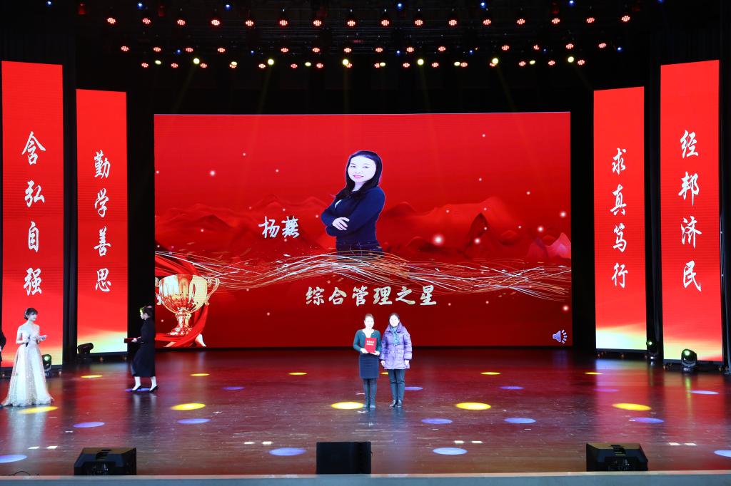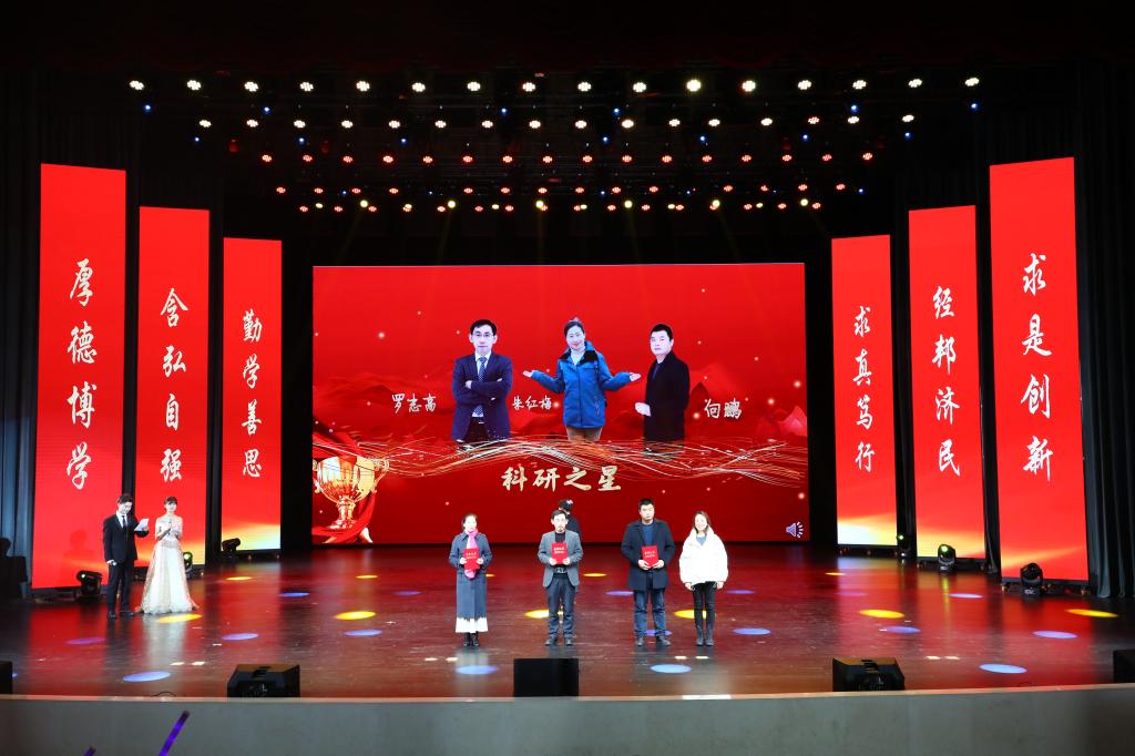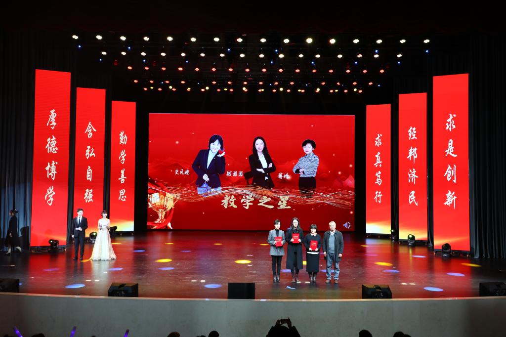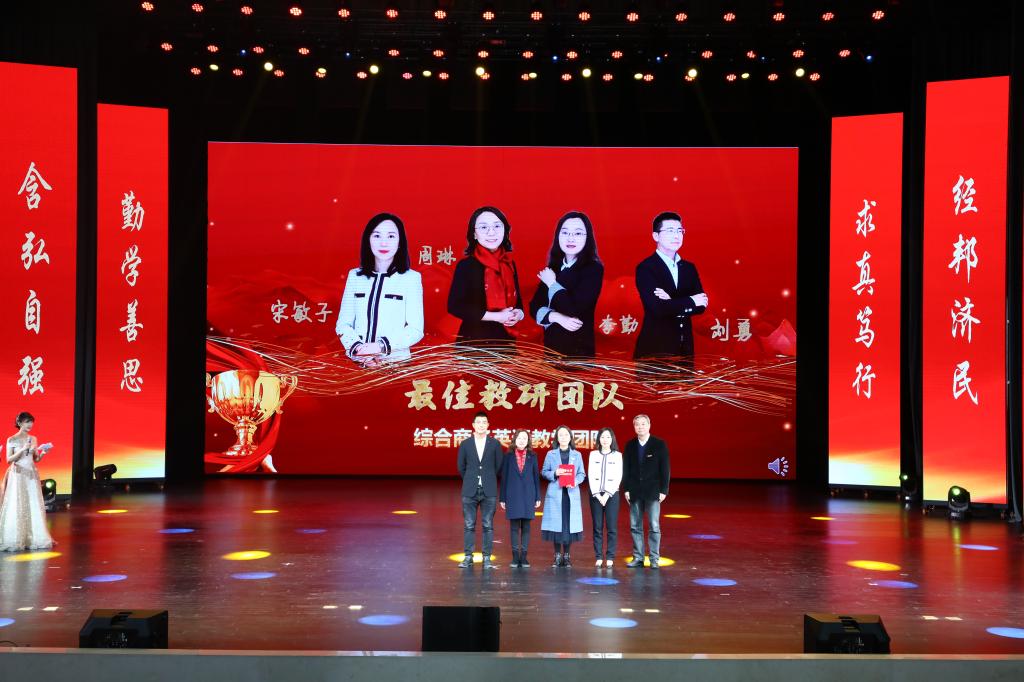 在教师颁奖环节中,李志雄为学院建设突出贡献奖“翻译硕士点申报团队”颁奖,李国军为学院最佳教研团队“综合商务英语教学团队”颁奖,李敬为最佳教研团队“PBL大学英语教学团队”颁奖,申卫东为学院“最美辅导员”丁亮老师颁奖,骆东奇为学院“教学之星”史凤晓、钱圆圆、蒋婧老师颁奖,钟增胜为学院“实践教学之星”王佳、邹莉老师颁奖,杨娟为学院“科研之星”向鹏、罗志高、朱红梅老师颁奖,于频为学院“综合管理之星”杨燕老师颁奖,张轶为学院工会活动之星“啦啦操团队”颁奖。