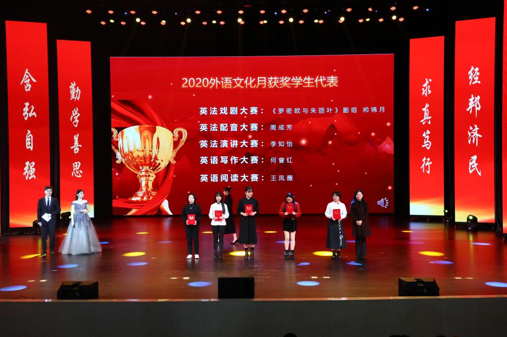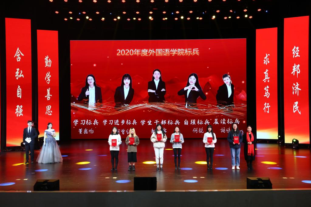 在学生颁奖环节中,陆嘉为学院省部级竞赛获奖学生代表颁奖,程亚为学院“外语文化月”系列赛事获奖学生代表颁奖,吴欢欢为学院2020年度学生标兵颁奖。