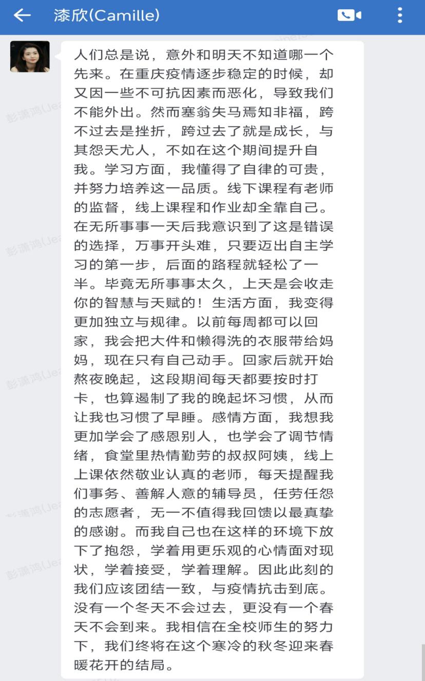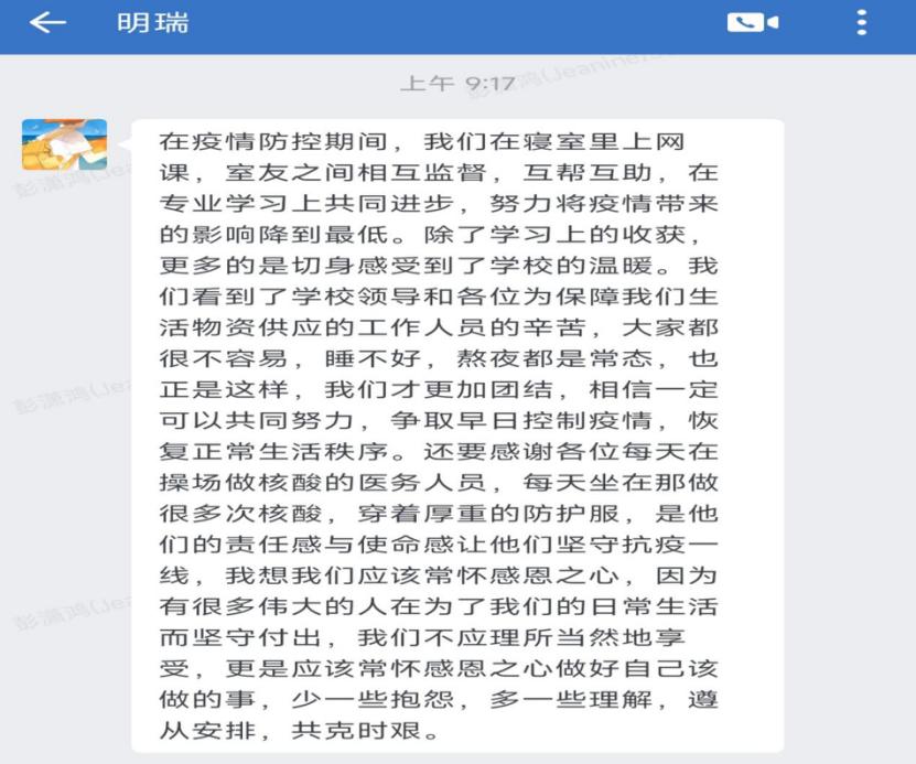 突如其来的疫情打乱了所有人的脚步,但同学们却都以良好的心态面对它,在此期间,有的同学感受到了人间真情,收获到了室友之间的友情;有的同学利用这个机会进行专业知识学习,提高自己专业素质;有的同学取餐时与送餐老师相互关心,增进了师生之间的情谊……