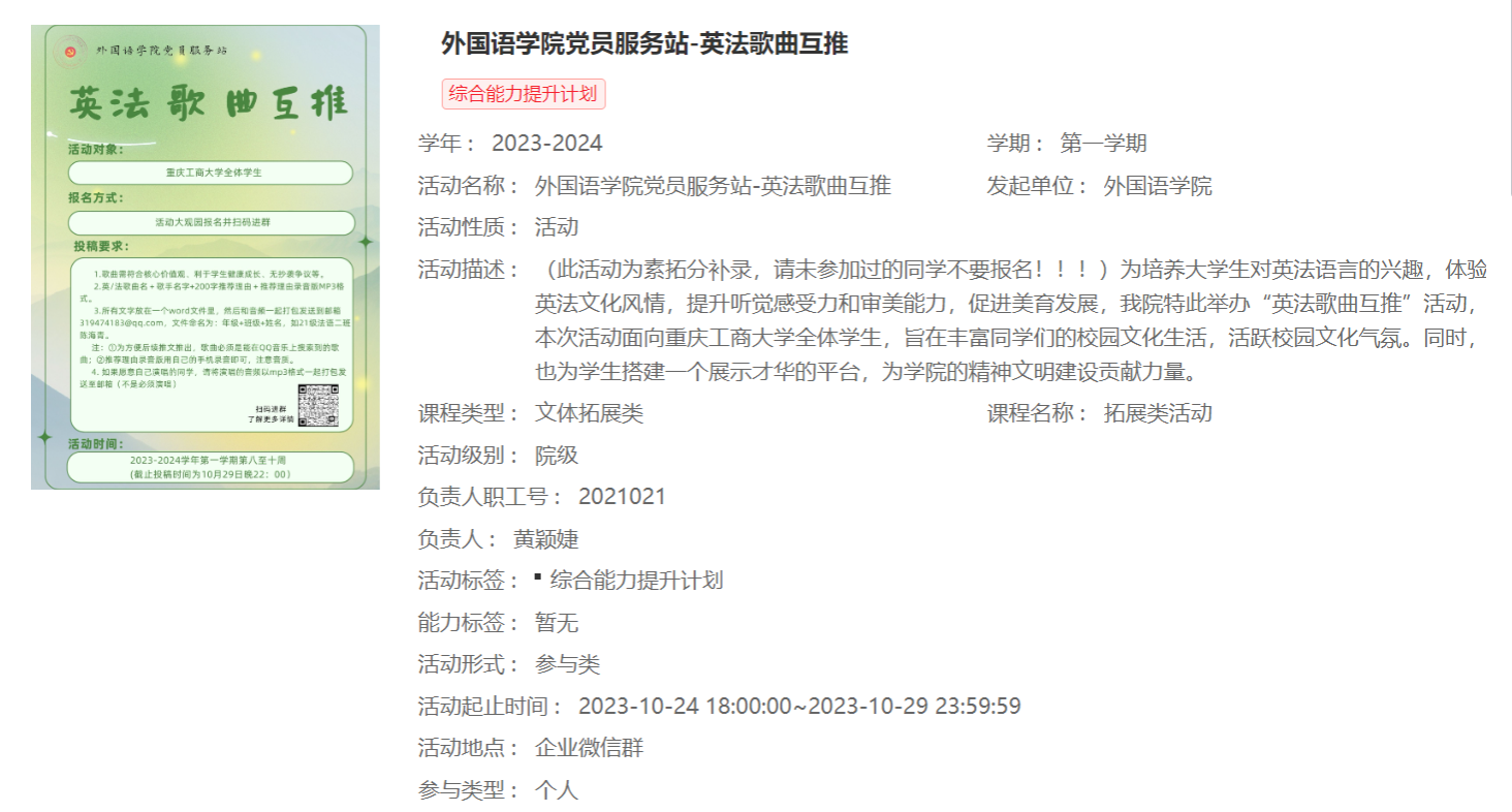 为激发大学生对英法语言的兴趣,2023-2024学年第一学期第八周至第十周,由永利集团3044am党员服务站主办的永利集团3044am党员服务站英法歌曲互推活动在CTBU外院党服公众号成功举办。参与本次活动的是重庆工商大学全体学生。