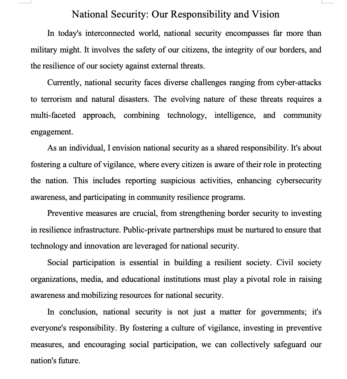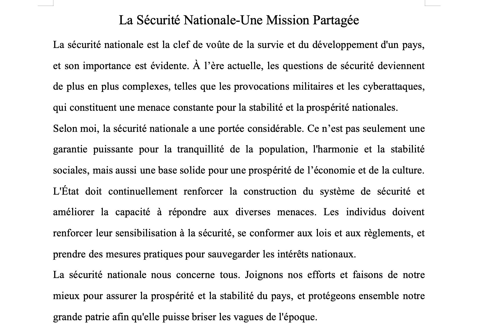 本次活动结合“一站式”学生社区主题系列活动相关要求,聚焦新时代国家安全取得的重大成就,并以总体国家安全观为引领,征集体现国家安全理念的外语征文,收到来自不同学院同学的20份投稿,参赛同学详细阐述和平与国家安全重要性,并强调个人在维护国家安全方面的责任,特别强调要加强对国家安全的敏感性和警惕性。