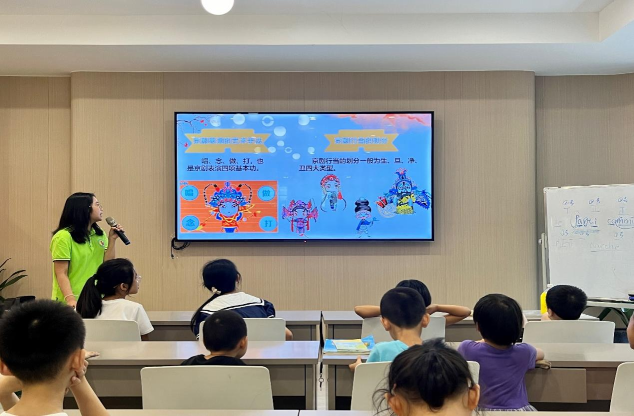 课程中,志愿者们不仅详尽阐述了戏曲的深厚历史脉络和各流派独具的韵味特色,还亲自为小朋友们展示了一些基础的戏曲动作和唱腔。在戏曲知识问答比赛环节,孩子们热情高涨,竞相抢答,在轻松愉悦的氛围中深化对戏曲知识的理解,充分展现了他们对中国传统戏曲文化的浓厚兴趣和旺盛求知欲。