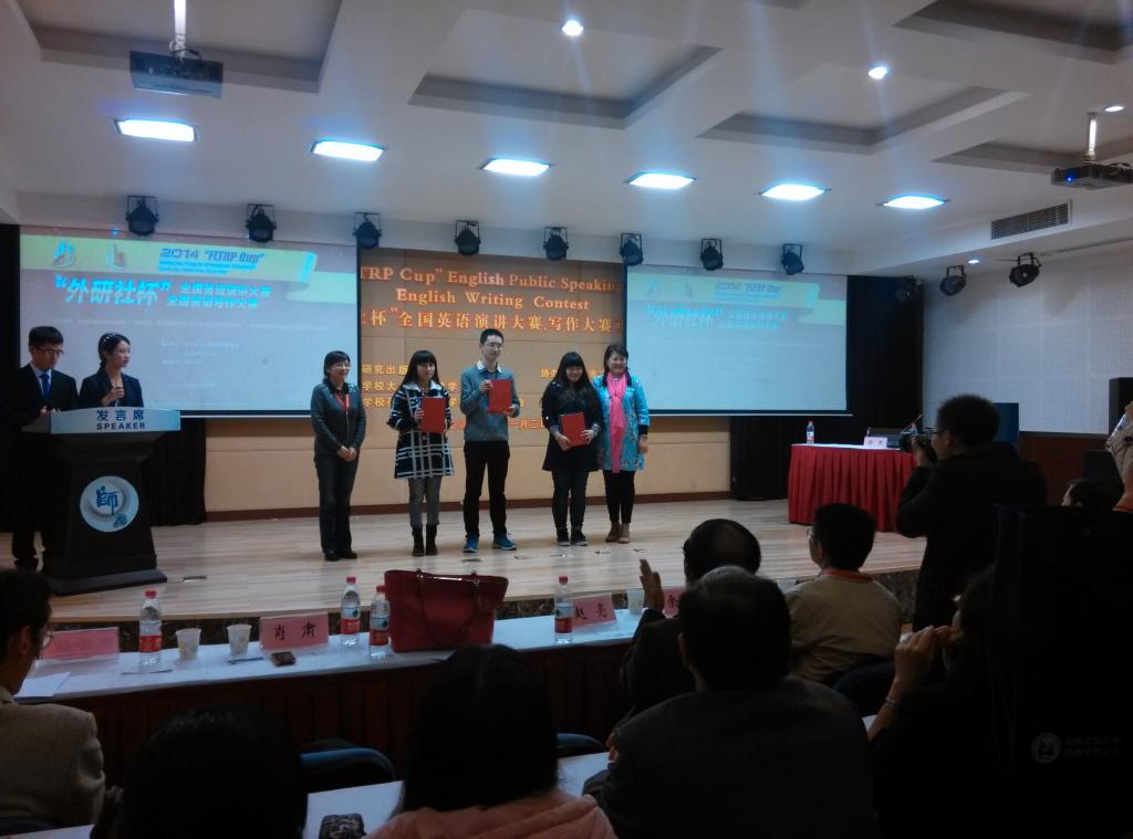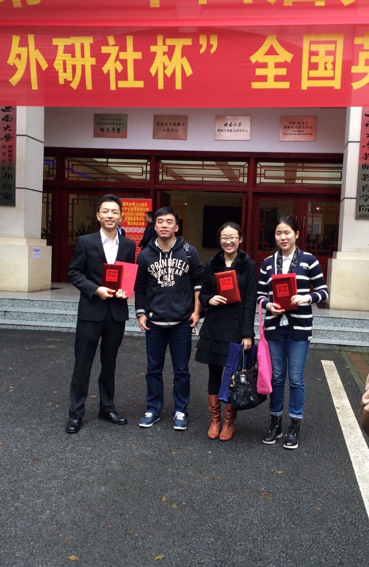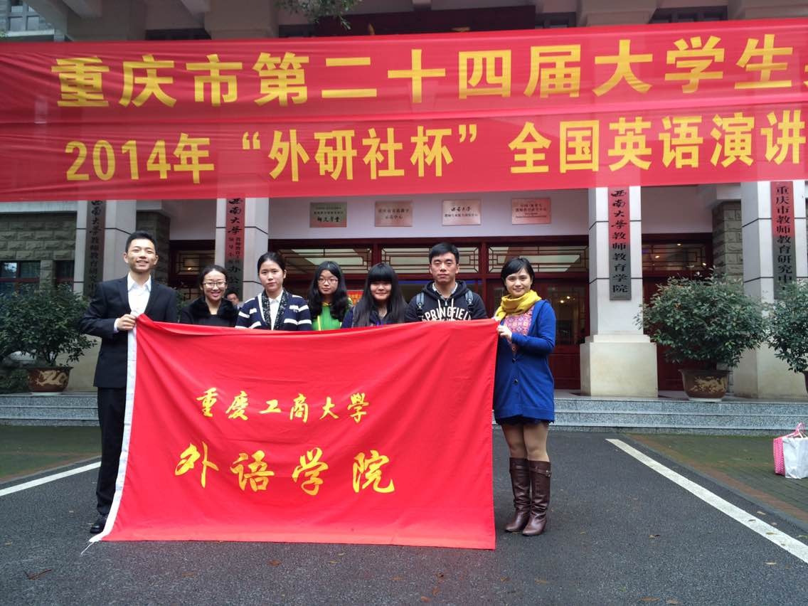 2014年11月2日,由重庆市大学外语教学研究会、重庆市外文学会主办的2014“外研社杯”全国英语演讲比赛、写作大赛重庆赛区选拔赛在西南大学举行。经过学校初赛选拔,外语学院倪晨岑、会计学院杨丽、经济学院冯颖、旅游与国土资源学院杨思卿、外语学院杨雨双分别代表我校参加写作比赛专业组、大外组和演讲比赛研究生组、大外组与专业组的比赛。外语学院张轶老师带队参加比赛。