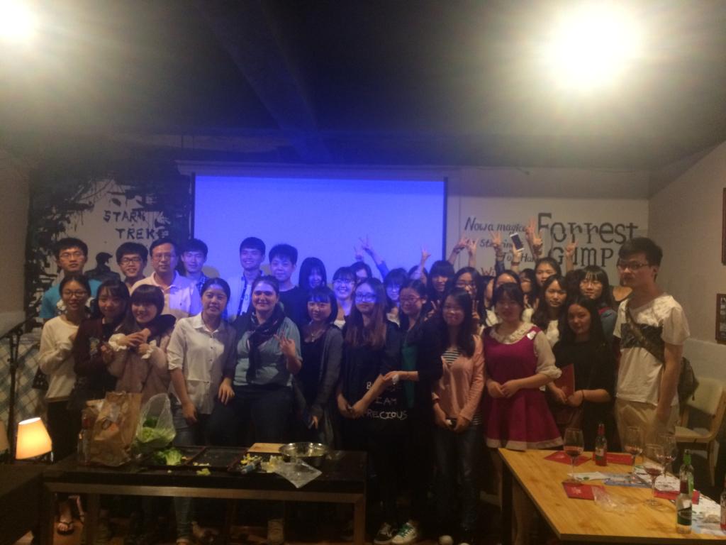 为了提高法语专业学生学习兴趣,加强中法文化交流与融合,由外语学院法语系、外语学院分团委学生会、欧憬法语共同主办的中法饮食文化交流会于2015年4月20晚18:30在香樟林“星电影”咖啡厅成功举办。参加本次活动的有外语学院法语系主任胡新宇老师、欧憬法语Cici和Emma老师以及外语学院法语专业12、13级学生。