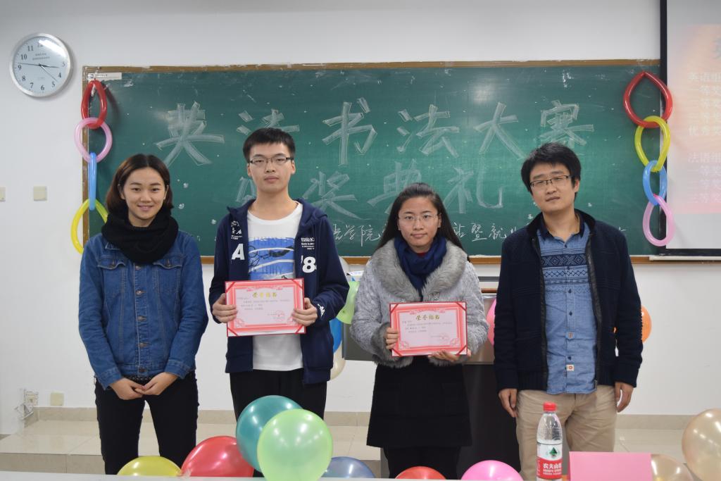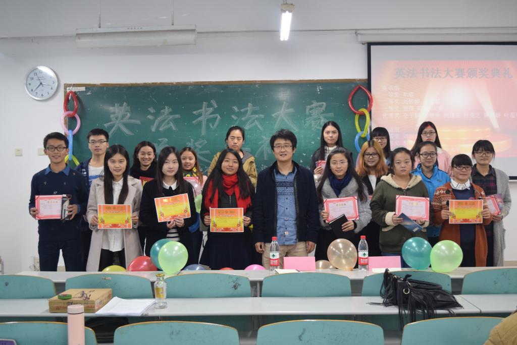 2015年12月6号下午3:00—4:00,外院学院南16A3党员服务站通讯宣传部在博智楼104教室举办英法书法大赛颁奖仪式。党员服务站指导老师王勇刚以及站长陈凤作为嘉宾出席了本次颁奖典礼。此外所有获奖选手、部分参赛选手以及通宣部干部干事参加了本次活动。